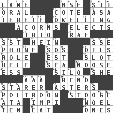 ACROSS 1. Unable to walk 5. Science/research agcy. 8. Be seated 11. Spoken 12. ____ d'Azur (French Riviera) 13. White ___ sheet 14. Cylindrical with tapered ends 17. Residence 19. Oak nuts 21. Chooses 22. Musical group of three 23. Actress Charlotte 24. Fast jet (abbr.) 27. Count _ (2 wds.) 29. Compass dir. 32. Give a jingle 34. Mayday 36. Lubricates 37. Hero or heavy, e.g. 38. Eastern Standard Time (abbr.) 39. Groove 40. Ubangi River tributary 41. Ocean 42. Trap for birds or small mammals 43. Double-curved letter 44. Grain storage tower 46. A female animal or person 47. American Automobile Association (abbr.) 50. Western Nevada city 52. A viewer who gazes fixedly 55. Michaelmas daisies 57. Coward 59. Moe Howard, for one 62. _ moment's notice (2 wds.) 63. Body of Kaffir warriors 64. Christmas carol 65. Nine, plus one 66. Erode 67. Singles DOWN 1. Car dealer's back yard 2. "We ___ not amused" (Victoria) 3. Hindu Mythology: god of death 4. Choose 5. Immediately 6. Bull 7. Man or boy (slang) 8. Ketch in the Levant 9. Is not 10. Labels 12. Music discs 15. Singer Mel 16. 4th largest of the Great Lakes 18. Area sheltered from the wind 20. Annoying sounds 24. Upset 25. Imelda's hoard 26. For Whom the Bell _____ 28. Olfactory organs 29. Grain storage towers 30. Splash clumsily 31. First name in cosmetics 33. Born 35. Flight of steps 36. Bear (Spanish) 42. Music written for nine 45. Allows 47. Nonscientific branch of learning 48. Nest on high 49. Scent 51. U. of Maine site 52. Petty quarrel 53. Carry 54. Actor Alda or Thicke 55. Cuckoo 56. Within a short period 58. Elect 60. Turn to the right 61. Raised railways