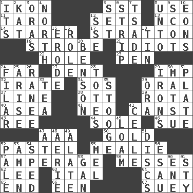 ACROSS 1. Image 5. Fast jet (abbr.) 8. Purpose 11. Pacific island yam 12. Puts into a specified state 13. Non-commissioned officer (abbr.) 14. A viewer who gazes fixedly 17. Ski resort town in Vermont 19. Disco prop 21. Foolish or stupid persons 22. Opening into or through something 23. Fenced enclosure 24. Distant 27. Scratch 29. Naughty child 32. Feeling or showing extreme anger 34. Distress signal 36. Of the mouth 37. Actor's bit 38. Baseball player Mel 39. Roll call or roster of names 40. At sea 41. Modern: prefix 42. 2nd pers. sing. pres. of can (arch.) 43. Portuguese money of account (variant) 44. Not divided or shared with others 46. Institute legal proceedings 47. Auto club (abbr.) 50. Gilt 52. Soft color 55. Ear of corn 57. Electrical Measurement 59. Makes clutter 62. Area sheltered from the wind 63. Slanted text style (abbr.) 64. Patter 65. Conclude 66. Car or cant ending 67. Chop _ DOWN 1. It is 2. Krazy ___ of comics 3. Mouths or openings 4. 0 degrees 5. Arrange properly for use 6. Remove all contents or possession from 7. Sadhe (variant) 8. To (old English) 9. Highlander 10. Immeasurably long periods of time 12. Compass dir. 15. Eat (away) 16. Hero or heavy, e.g. 18. Metal container 20. Gillaume's butler role 24. Having threads 25. Ascend 26. The wife of a rajah (variant) 28. Hauls 29. Removes the wrinkles 30. Taiwanese island in East China Sea 31. Food holder 33. Beverage made from leaves 35. Moe Howard, for one 36. Mouth or opening 42. Cell (Danish) 45. Rich soil 47. Had dinner 48. Nest on high 49. Having winglike extensions 51. Flat circles 52. Light colored 53. So be it 54. Drove too fast 55. Cartoonist voice _ Blanc 56. Son of Isaac 58. Separate the seeds from cotton 60. Compass dir. 61. Filthy place