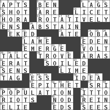 ACROSS 1. Flats, for short 5. Benjamin's nick name 8. Straggles 12. Attempt 13. "We ___ not amused" (Victoria) 14. It is permitted: Lat. 15. Israeli folk dance 16. Rotating or pertaining to rotation 19. Followers of ems 20. Choose not to consume 21. Supplemented with great effort 23. Had dinner 24. Chief or king in Benin or Nigeria 27. Unable to walk 30. Locale of original sin 31. Develop 34. Electrical Unit 35. Baby powder 38. Collection of objects 40. Caspian sea tributary 41. Part of Q.E.F. 42. Dirtied 44. Elected reps. 45. Welles in "The Third Man" 46. Label 47. Curvy letter 50. It may be bright or harebrained 53. Curse 57. Indian title of respect (Mr.) 59. Census information 63. "Tell ____ the Marines!" 64. Disturbances 65. Lower and raise head in agreement 66. It's straight from the horse's mouth 67. Writer Wiesel 68. Begley and Asner 69. Observes DOWN 1. American tennis player Robert 2. Give a jingle 3. Cod relative 4. R.R. building 5. Sharp remark 6. Greek god of love 7. Remaining after all deductions 8. 54 in ancient Rome 9. Adept person 10. Set 11. Filthy place 14. Actor's bit 17. American Automobile Association (abbr.) 18. Teat (slang) 20. First of billions? 22. Opts 24. Aroma 25. Actor Lugosi 26. Pismires 28. Was introduced to 29. Blunders 30. Dodged 32. Thick or sticky substance 33. Morally bad or wrong 35. Trial 36. Length times width 37. Austrian-born American filmmaker Fritz 39. Biblical high priest 43. Send forth 47. Snakelike fish 48. Health resort 49. Be seated 51. First name in cosmetics 52. Nick name for Arthur 54. Prong on a fork 55. Parka part 56. Extremities 58. Charged particles 59. Before (prefix) 60. Petroleum 61. Luau course 62. Shoshoni 63. Big collection agency