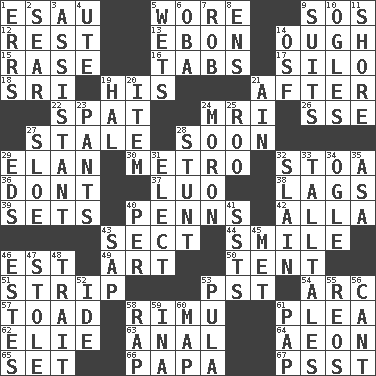 ACROSS 1. He sold his birthright 5. Had on 9. Mayday 12. State of inaction 13. Inky black, to poets 14. Ending for "Through" and "Enough" 15. To erase 16. Bar bills 17. Grain storage tower 18. _ Lanka 19. Part of HMS, perhaps 21. Following 22. Argument over a trivial matter 24. Medical imaging device (abbr.) 26. Compass dir. 27. Lacking originality or spontaneity 28. Within a short period 29. Enthusiasm 30. Paris' subway 32. Portico 36. Do not 37. Nilotic language 38. Straggles 39. Arranges properly for use 40. Actor Sean's family 42. Silent film actress Nazimova 43. Religious group 44. Grin 46. Eastern Standard Time (abbr.) 49. Tate display 50. Portable shelter 51. Remove all contents or possession from 53. Pacific Standard Time (abbr.) 54. Curve 57. Frog relative 58. Tall New Zealand timber tree 61. Entreaty 62. Writer Wiesel 63. Of or related to the anus 64. Period of immesurable duration 65. Arrange properly for use 66. Dad 67. Inconspicuous attention getter DOWN 1. Blunders 2. Wither 3. Aide 4. Shoshoni 5. Moistens 6. Chief or king in Benin or Nigeria 7. Director Reiner 8. Followers of ems 9. Sets of matching outer garments 10. Stares at amorously 11. Dinah or Pauly 14. Order of Saint Francis (abbr.) 19. Actor Linden 20. A whole individual unit 21. The 18th letter of the Arabic alphabet 23. Leg coverings 24. Person of subnormal intelligence 25. Friend of Pooh 27. A type of plum 28. Difficult or unusual or dangerous feat 29. Begley and Asner 31. Opt 32. Killed 33. Baron Munchausen's specialties 34. Stare 35. White ___ sheet 40. For each 41. Fast planes 43. Plant excrement 45. Was introduced to 46. _____ Park, CO 47. Took without asking 48. Distinguishing feature 52. Binary compound 53. Monetary unit of Botswana 55. Vintage cars 56. Patter 58. Hit sharply and swiftly 59. _ tizzy (2 wds.) 60. Atlas unit 61. Infant food