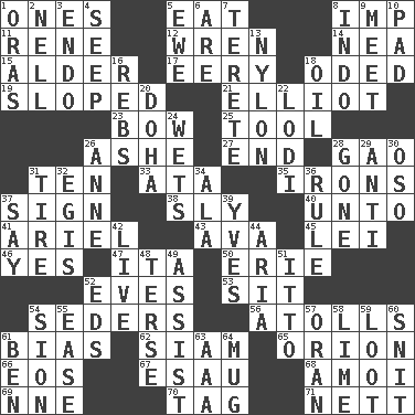 ACROSS 1. Washington bills 5. Ingest 8. Naughty child 11. French philosopher Descartes 12. Songbird 14. Teachers' org. 15. Tree or shrub in the Birch family 17. Suggestive of the supernatural 18. Wrote a lyric poem 19. Inclined 21. American author Paul (1891-1958) 23. Ribbon knot 25. Utensil 26. American tennis player Robert 27. Conclusion 28. E Mali city 31. "___ Little Indians" 33. "One Day ___ Time" 35. Removes the wrinkles 37. Attach a signature 38. Roguish 40. To (old English) 41. Satellite of Uranus 43. Actress Gardner 45. Luau accessory 46. It is so 47. Call ___ day 50. 4th largest of the Great Lakes 52. Nights before holidays 53. Be seated 54. Spring feasts 56. Ringlike coral islands and reefs 61. Prejudice 62. Thailand, formerly 65. Constellation of myth 66. Greek goddess of the dawn 67. Son of Isaac 68. Mine, in Marseilles 69. Compass dir. 70. Label 71. Remaining after all deductions DOWN 1. Mouths or openings 2. 1994 drama film starring Jodie Foster 3. Inside; within (prefix) 4. Ooze 5. She-sheep 6. "We ___ not amused" (Victoria) 7. Cylindrical with tapered ends 8. _ china 9. Confront 10. Groovy apt. 13. High-strength synthetic material 16. Confederate soldiers (slang) 18. Petroleum 20. Capital of the state of Qatar 22. Farming town in central California 24. Moistens 26. Singer Murray 28. Went 29. Opposed to 30. Bear (Spanish) 31. Hoop that covers a wheel 32. The front part of a cuirass 34. Wing 36. Court order 37. Declare 39. Jacques Cousteau's middle name 42. Moving, as bait 44. Operatic vocal solo 48. Laconic 49. Aid 51. "Tell ____ the Marines!" 52. Begley and Asner 54. The Jewish people; Israel 55. Comfort 57. NW Algerian seaport 58. Welles in "The Third Man" 59. Plunder 60. In a ____ (agitated or irritated) 61. Benjamin's nick name 63. Auto club (abbr.) 64. Large cup