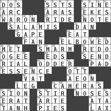 ACROSS 1. Two (Sp.) 4. Fast planes 8. Trig term 12. Curve 13. Caspian sea tributary 14. Makes supply last 15. Make _____ (do battle with) 18. Travel on an animal 19. Make mention of 20. Deli grouping 22. One of the 12 tribes of Israel 23. Open wide 24. Erode 25. Air blower 26. Turned at an angle; bent 30. Was introduced to 33. Excessive but superficial compliments 36. Do over again 37. Double curve, resembling the letter S 39. Begley and Asner 40. Post 41. Monetary unit of Yemen 42. More peculiar 44. Writing tablet 45. Substance 47. Baseball player Mel 50. Large container 51. Age 53. Part of a journey 54. Devices for capturing images 57. The Jewish people; Israel 59. Disorderly outburst 61. Olfactory organs 63. Part of Q.E.F. 64. Johnson of "Laugh-In" 65. "One Day ___ Time" 66. Hyperbolic tangent 67. Sliced desserts 68. Not strict DOWN 1. Simpleton 2. Mouths or openings 3. Strangle with an iron collar 4. Indian skirt 5. Indian titles of respect 6. Small amount or degree 7. Compass dir. 8. Legislators 9. Picture 10. Fish or hair follower 11. Compass dir. 16. Norwegian king 17. California wine valley 21. Not women's 22. Apply (a substance) by light strokes 24. Shade tree 26. Celtic language 27. Shed a tear 28. Pulitzer Prize-winning author Ferber 29. Texas town _ City 30. Greater amount 31. Armor plate that protects the chest 32. Afternoon social gatherings 34. Ancient Persian 35. Say or write further 38. Veterans Day date 42. Sep. follower 43. Wander 46. Tired old horse 48. Adolescent 49. "Corrida" creature 52. Relating to the nose 53. Grant temporary use of 54. Quote 55. Ancient Greek god of war 56. Bristle 57. Put into a specified state 58. Lyricist Gershwin 59. Plant excrement 60. Three (prefix) 62. Saxophone