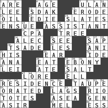 ACROSS 1. "We ___ not amused" (Victoria) 4. Mature 7. ____ Bator 11. Area sheltered from the wind 12. Neighbor of Neb. 13. Wear away 14. Lubricate 15. Singer Brickell 16. Chalkboards 17. Take place subsequently 19. Aide 21. Tax preparer (abbr.) 23. Woody plant 24. Actor Baldwin 25. Perceive with the eye 26. Plant excrement 29. Sadhe (variant) 30. French article 31. Cuckoo 32. Part of HMS, perhaps 33. Ewer handle 34. Binary compound 35. Santa ___, CA 36. Consume 37. Dark wood 40. Flowery wreath 41. Had dinner 42. Table seasoning 43. Old wives' tales, e.g. 45. Pipe bend 46. Home 51. Grayish beige 55. Spoke pompously 56. Straggles 58. River (Sp.) 59. Hauls 60. At sea 61. Commissioned military rank (abbr.) 62. SW Saudi Arabia district 63. Cartoonist voice _ Blanc 64. Double-curved letter DOWN 1. Medicinal plant 2. It's straight from the horse's mouth 3. Snakelike fish 4. Say or write further 5. Greek goddess of the earth (variant) 6. Supplements with great effort 7. A salt of uric acid 8. Globular water bottle used in Asia 9. An important port of Yemen 10. Egg locale 12. Oozed 13. Otherwise 16. Begets 18. Southern CA. univ. 20. Navigate 22. Adept person 24. Slender Brazilian palm 25. Chalkboard 26. Inhabitant of Heaven 27. "60 Minutes" Commentator Rooney 28. Sliced dessert 29. Prong on a fork 32. Actor Linden 33. Consumed 36. Having ears or earlike features 37. Compass dir. 38. Greek mezzo-soprano Agnes 39. Spanish pot 43. 61 cubic inches 44. Lyric poems 46. Round or rotation of duties 47. Greek god of love 48. Suttee (variant) 49. Burrowing marine mollusk 50. Comfort 52. Goad 53. Sliced desserts 54. Immeasurably long periods of time 57. Set