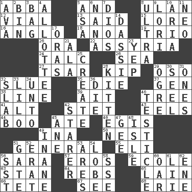 ACROSS 1. Swedish rock group 5. Also 8. Uhlan (variant) 12. Small bottle 13. Expressed in words 15. Old wives' tales, e.g. 16. White American of non-Hispanic descent 18. Small Philippine buffalo 19. Musical group of three 20. Mouth or opening 22. Nineveh was its capital 24. Baby powder 26. Ocean 27. Russian ruler of old 28. Monetary unit of Laos 29. Bear (Spanish) 32. Turn sharply 35. Singer Brickell 37. Commissioned military rank (abbr.) 38. Actor's bit 39. Small island 40. Woody plant 41. The first octave above the treble staff 42. Proofreading order 43. Snakelike fish 44. Oct. 31 cry 45. Had dinner 46. Armor plate that protects the chest 49. _ tizzy (2 wds.) 50. A home for chicks 51. Commissioned military rank 55. Connecticut Ivy Leaguer 56. "Two Mules for Sister ____" 57. Greek god of love 59. Learning spot: Fr. 63. Comedian Laurel of Laurel & Hardy 64. Confederate soldiers (slang) 65. (Had) reclined 66. False hair 67. Observe 68. 4th largest of the Great Lakes DOWN 1. Actress Gardner 2. Storage container 3. Paper or plastic container 4. One to whom something is allotted 5. White ___ sheet 6. Nanny 7. "Vaya con ____" 8. Extreme 9. Australian parrot (variant) 10. Roberta Peters solo 11. Modern: prefix 14. Hyrax 17. Mouths or openings 21. According to 23. Slangy assent 25. Make 28. Baby cat 29. Legendary monster 30. Stitch closed the eyes of (a falcon) 31. Washington bills 32. Broad, flat, thick piece 33. _ and Stitch 34. To (old English) 36. Expire 40. One of the two male reproductive glands 42. A viewer who gazes fixedly 45. A saturated hydrocarbon 47. Turn to the right 48. Small island 49. Silly 51. Yard entry 52. Part of Q.E.F. 53. Ancient Greek god of war 54. Ear part 56. Fast jet (abbr.) 58. Compass dir. 60. Boat paddle 61. Cards in a Roman deck? 62. Compass dir.