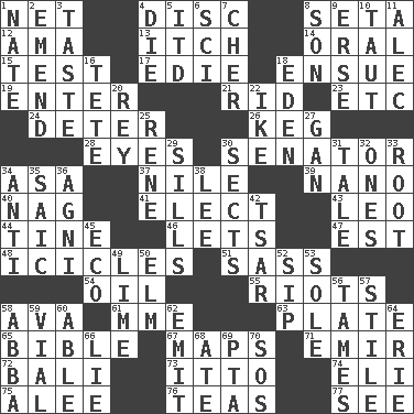ACROSS 1. Fish or hair follower 4. Flat circle 8. Stalk of a moss capsule 12. Nursemaid (var.) 13. Hankering 14. Taken by mouth 15. Trial 17. Singer Brickell 18. Take place subsequently 19. Keyboard key 21. To free from 23. And so on (abbr.) 24. Prevent from occurring 26. Cask 28. Sight organs 30. Legislator 34. White ___ sheet 37. The longest river in the world 39. Billionth: prefix 40. Tired old horse 41. Voters do this 43. Lion 44. Prong on a fork 46. Allows 47. Eastern Standard Time (abbr.) 48. Winter's stalactites 51. Backtalk 54. Petroleum 55. Disturbances 58. Actress Gardner 61. Madame (abbr.) 63. Food holder 65. God's Word 67. Atlas contents 71. Arab leader 72. Indonesian resort city 73. "Tell ____ the Marines!" 74. Connecticut Ivy Leaguer 75. Toward shelter 76. Beverages made from leaves 77. Observe DOWN 1. Nathan's nickname 2. Make improvements or corrections to 3. Clothes sense 4. Expire 5. It would 6. _-fi 7. "Mermaids" star 8. Boy, to dad 9. Celtic language 10. Drawn tight 11. Actor Baldwin 16. False hair 18. Locale of original sin 20. Marina Del _, California 22. D.D.E's nickname 25. French philosopher Descartes 27. Separate the seeds from cotton 29. Beverly of Met fame 30. Religious groups 31. Lie 32. Singles 33. Carrot, for example 34. Opposed to 35. Ketch in the Levant 36. Hindu god of fire 38. Area sheltered from the wind 42. Russian ruler of old 45. Environmental prefix 49. Welles in "The Third Man" 50. Shade tree 52. Small drink 53. Not divided or shared with others 56. Corrects by punishment or discipline 57. Vertical member of a panel or frame 58. Swedish rock group 59. Small bottle 60. Competent 62. Give off 64. One of the Great Lakes 66. Untruth 68. Had dinner 69. Parent Teacher Association (abbr.) 70. Distress signal