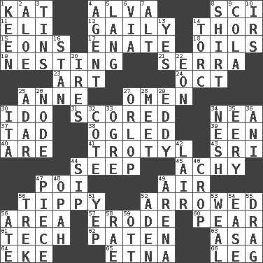 ACROSS 1. Krazy ___ of comics 4. Inventor's middle name 8. _-fi 11. Connecticut Ivy Leaguer 12. Lightheartedly 14. Son of Odin 15. Immeasurably long periods of time 17. Related on the mother's side 18. Lubricates 19. Nestling 21. Spanish missionary in California 23. Nonscientific branch of learning 24. Sep. follower 25. Singer Murray 27. Presage 30. Wedding promise 31. Tallied 34. Teachers' org. 37. Small boy 38. Stared 39. Car or cant ending 40. "We ___ not amused" (Victoria) 41. Trinitrotoluene 43. _ Lanka 44. Ooze 45. Painful 47. Luau course 49. Wind 50. Likely to tip or tilt 52. Moved like an arrow 56. Type of rug 57. Eat (away) 60. Lightbulb-shaped fruit 61. Technology 62. Eucharist need 63. White ___ sheet 64. Supplement with great effort 65. Inactive volcano in Sicily 66. Part of a journey DOWN 1. Peachy ____! 2. _ vera 3. Airtight sealed metal containers 4. Representative 5. Austrian-born American filmmaker Fritz 6. By way of 7. The first octave above the treble staff 8. Upper-body garment 9. Root beer relative 10. Big collection agency 13. Affirmative reply 14. Torque (variant) 16. Comedian Laurel of Laurel & Hardy 20. Angers 22. Age 25. The sixth month of the Jewish calendar 26. Thickened enlargement 27. Fourth or lowest deck 28. Rendezvous 29. Whirlpool 30. Call ___ day 32. ____ d'Azur (French Riviera) 33. Legendary monster 34. Soft 35. Suggestive of the supernatural 36. Black tropical American cuckoo 42. Den 44. Small drink 46. Riding implement 47. Component 48. Brightly colored fish 49. Sports stadium 50. Long journey 51. Slangy assent 52. Arabian gulf 53. Welt 54. Relaxation 55. To draw with force 56. Had dinner 58. Actress Charlotte 59. Baseball player Mel