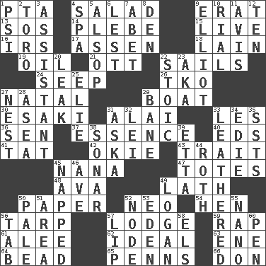 ACROSS 1. Parent Teacher Assoc. 4. Vegetable dish 9. Part of Q.E.F. 13. Mayday 14. Military trainee 15. Not recorded 16. Big collection agency 17. NE Netherlands city 18. (Had) reclined 19. Petroleum 21. Baseball player Mel 22. Moves on water 24. Ooze 26. Ring climax 27. Relating to or accompanying birth 29. Water vessel 30. 1973 Nobel Price Winner (Physics) Leo 31. Jai _ 33. French article 36. Elected rep. 37. Gist 40. Begley and Asner 41. Make lace 42. Migrant worker of the '30s 43. Distinguishing feature 45. Nanny 47. Lugs 48. Actress Gardner 49. Thin strip of wood or metal 50. Some stationery 52. Modern: prefix 54. Layer 56. Canvas cover 57. Cabin 59. Reproach for some lapse or misdeed 61. Toward shelter 62. Standard of perfection 63. Compass dir. 64. Necklace unit 65. Actor Sean's family 66. Spanish title DOWN 1. 23rd letter of the Greek alphabet 2. "Corrida" creature 3. Helper 4. Health resort 5. Columnist Joseph or Stewart 6. For fear that 7. Collude with 8. Lair 9. American author Paul (1891-1958) 10. Monetary unit of Yemen 11. Deliberation 12. Nine, plus one 20. Path through which fluid escapes 22. Unemotional 23. Alias (abbr.) 25. Writer Wiesel 27. A home for chicks 28. At sea 29. Object of repulsion 31. "____ silly question..." 32. Flowery wreath 33. Resembling or made to resemble leather 34. Singer Brickell 35. Fast planes 38. Underwater navigation system 39. Singer James 44. Writer of Portnoy's Complaint (1969) 45. Slept 46. "___ Maria" 49. Utah city north of Ogden 50. Light colored 51. Length times width 52. Thickened enlargement 53. Locale of original sin 55. Billionth: prefix 56. Keyboard key 57. Mouth edge 58. Raised railways 60. Writing instrument