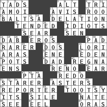 ACROSS 1. Bits 5. The first octave above the treble staff 8. Three (prefix) 11. Mine, in Marseilles 12. Deliberation 13. Friend of Pooh 14. Greek mezzo-soprano Agnes 17. Accusation by an informer 19. Looked after 21. Foolish or stupid persons 22. Singe 23. Elected rep. 24. Pat or tap gently 27. Greek god of love 29. Writing tablet 32. More uncommon 34. Two (Sp.) 36. Australian parrot (variant) 37. Caspian sea tributary 38. Compass dir. 39. Locale of original sin 40. Plant holders 41. June honoree 42. Canadian anthropologist Darnell 43. Followers of ems 44. Western Nevada city 46. Ewer handle 47. Parent Teacher Association (abbr.) 50. Make new 52. A viewer who gazes fixedly 55. Michaelmas daisies 57. Newsperson 59. Tootsie (variant) 62. It is 63. Filth; sediment 64. Nathan's nickname 65. Observe 66. Snakelike fish 67. Mouths or openings DOWN 1. Keyboard key 2. Nursemaid (var.) 3. Stupid person 4. Settings 5. "___ Maria" 6. Ms. Damita and namesakes 7. Sadhe (variant) 8. Musical group of three 9. Carrot, for example 10. Charged particles 12. Increase 15. Scornful expression 16. The sixth month of the Jewish calendar 18. Metal container 20. Worn away 24. Window treatment 25. Composer Copland 26. Naughty children 28. Echolocation 29. Porridge 30. Sports stadium 31. Middle Eastern gold or silver currency 33. Double-curved letter 35. Spring feasts 36. Area sheltered from the wind 42. Cowboy competition 45. Remaining after all deductions 47. Adept person 48. Laconic 49. Nick name for Arthur 51. U. of Maine site 52. Indian titles of respect 53. False hair 54. Domed church section 55. "We ___ not amused" (Victoria) 56. Play the lead 58. Pipe bend 60. R.R. building 61. Consenting reply