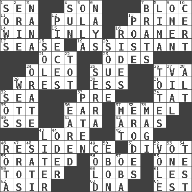 ACROSS 1. Elected rep. 4. Boy, to dad 7. Coalition 11. Mouth or opening 12. Monetary unit of Botswana 13. First class 14. Acquire through effort 15. Inwardly 16. Nomad 17. Gospel singer Marvin 19. Aide 21. Sep. follower 23. Lyric poems 24. Butter sub 25. Institute legal proceedings 26. Federal power corp. 29. Take or capture by force 30. Curvy letter 31. Petroleum 32. Ocean 33. Before (prefix) 34. Make lace 35. Baseball player Mel 36. Ewer handle 37. Klaipeda city 40. Compass dir. 41. "One Day ___ Time" 42. Ancient river in northeast Turkey 43. Old wives' tales, e.g. 45. Coat; cloak 46. Home 51. A piece of turf (Scot.) 55. Declaimed 56. Mitch Miller's instrument 58. Single 59. Carrier 60. Tennis shots 61. French article 62. SW Saudi Arabia district 63. Heredity factor (abbr.) 64. Eastern Standard Time (abbr.) DOWN 1. Sty mamas 2. One of the Great Lakes 3. Grandmother 4. Player for Phoenix 5. Water jar 6. Negative votes 7. Naughty children 8. Pale green bean 9. Sign of something about to happen 10. An absolute certainty 12. Components 13. Introduce or present, as a question 16. Amusement-park features 18. Not divided or shared with others 20. Boozer 22. Small child 24. Declaim 25. Father Junipero _ 26. Lugs 27. Small bottle 28. The first octave above the treble staff 29. Moistens 32. Distress signal 33. Eucharist need 36. Having ears or earlike features 37. Floor protector 38. Eats (away) 39. Wise men 43. 61 cubic inches 44. Baltic tributary 46. Roll call or roster of names 47. Greek god of love 48. Suttee (variant) 49. Chilled 50. Inky black, to poets 52. Grand slam 53. Singles 54. Trial 57. Chief or king in Benin or Nigeria