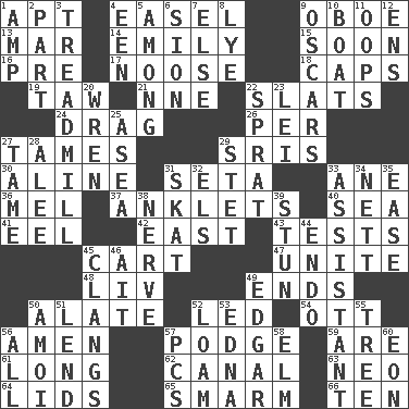 ACROSS 1. Fitting 4. Artist's stand 9. Mitch Miller's instrument 13. Impair 14. Poet Dickinson 15. Within a short period 16. Before (prefix) 17. Trap for birds or small mammals 18. Smile enhancers 19. The 23rd letter of the Hebrew alphabet 21. Compass dir. 22. Narrow boards 24. To trail on the ground 26. For each 27. Domesticates 29. Indian titles of respect 30. Place in a line 31. Bristle 33. One (Scot) 36. Cartoonist voice _ Blanc 37. Short socks 40. Ocean 41. Snakelike fish 42. Compass direction 43. Trials 45. Draw slowly or heavily 47. Join together 48. 54 in ancient Rome 49. Conclusions 50. Having winglike extensions 52. Directed 54. Baseball player Mel 56. So be it 57. Plash 59. "We ___ not amused" (Victoria) 61. Having great length 62. Lessep's creation 63. Modern: prefix 64. Hats (slang) 65. Excessive but superficial compliments 66. Nine, plus one DOWN 1. Electrical Unit 2. Component 3. Excercise machine 4. Car or cant ending 5. Amid 6. The Jewish people; Israel 7. Otherwise 8. Sodium hydroxide 9. Motion picture awards 10. Water vessel 11. I made a mistake 12. Followers of ems 20. Songbird 22. Small fatty European fish 23. Flowery wreath 25. At sea 27. Not wild 28. Toward shelter 29. Proofreading order 31. Three-handed card game 32. Raised railways 33. Aide 34. Remaining after all deductions 35. Relaxation 38. Impudent aggressiveness 39. Astound 44. Inside; within (prefix) 45. Rigngs loudly 46. Small island 49. _ Allan Poe 50. Mine, in Marseilles 51. Grant temporary use of 52. Rich soil 53. Pulitzer Prize-winning author Ferber 55. Relationship diagram 56. Everything 57. Personal Computers (abbr.) 58. Shade tree 60. A really long time