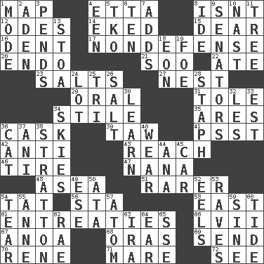ACROSS 1. Atlas unit 4. Singer James 8. Is not 12. Lyric poems 14. Supplemented with great effort 15. Letter starter 16. Gouge 17. Unrelated to defense, as in spending 20. Inside; within (prefix) 21. "Barney Miller" actor Jack 22. Had dinner 23. Table seasonings 27. A home for chicks 29. Relating to the mouth 31. Lacquered or enameled metalware 34. Vertical member of a panel or frame 35. Ancient Greek god of war 36. Keg 39. The 23rd letter of the Hebrew alphabet 41. Inconspicuous attention getter 42. Against 43. Arrive at 46. Hoop that covers a wheel 47. Nanny 48. Toward the sea 51. More uncommon 54. Make lace 56. R.R. building 58. Compass direction 61. Pleas 66. 57 in ancient Rome 67. Small Philippine buffalo 68. Mouths or openings 69. Transmit 70. French philosopher Descartes 71. Female horse 72. Perceive with the eye DOWN 1. Method 2. An important port of Yemen 3. Depends 4. Car or cant ending 5. Ring climax 6. "___ Little Indians" 7. Does sums 8. Binary compound 9. Legislators 10. Political cartoonist Thomas 11. Woody plant 13. Portico 18. Period of immesurable duration 19. Enemy 24. Car dealer's back yard 25. Three (prefix) 26. Table seasoning 28. Staphylococcus 30. Memorize 32. French article 33. Eastern Standard Time (abbr.) 34. Atmospheres 36. Domesticated feline 37. Black tropical American cuckoo 38. Ski resort town in Vermont 40. Put on (as clothing) 44. Santa ___, CA 45. 4-wheeled motor vehicle 49. Compass dir. 50. _ moment's notice (2 wds.) 52. Snakelike fish 53. All-night dance parties 54. Rend 55. Queen of England 1702-14 57. Smallest unit of an element 59. Trig term 60. Event that recurs at intervals 62. Actress Charlotte 63. Lyricist Gershwin 64. Hearing organ 65. Compass dir.