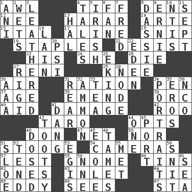 ACROSS 1. Leather borer 4. Small quarrel 8. Hiding places for outlaws 12. Born 13. Ethiopian city, capital of Harari 14. Johnson of "Laugh-In" 15. Slanted text style (abbr.) 17. Place in a line 18. Sever or remove by pinching or nipping 19. Paper fasteners 21. Cease 23. Part of HMS, perhaps 24. A female animal or person 26. Expire 27. Painter Guido (1575-1642) 28. Leg joint 30. Atmosphere 31. Food allowance for one day 34. Writing instrument 37. Ripen 38. Make improvements or corrections to 39. The grampus (Milton) 40. Assist 41. Break 42. Friend of Pooh 43. Pacific island yam 44. Chooses 46. Spanish title 47. Fish or hair follower 50. And not 51. Moe Howard, for one 54. Devices for capturing images 57. For fear that 58. Dwarf 60. Canisters 62. Washington bills 63. An arm off of a larger body of water 64. Make a knot 65. Whirlpool 66. Observes 67. R.R. building DOWN 1. Black tropical American cuckoo 2. Soaks 3. Resembling or made to resemble leather 4. Falsehoods 5. From or relating to Ireland 6. Avid follower 7. Flintstone 8. Hyrax 9. Bert's buddy 10. Nuclear Threat Initiatives 11. Back-to-school mo. 13. Actor Linden 16. (Had) reclined 20. 23rd letter of the Greek alphabet 22. Locale of original sin 25. Supplementing with great effort 27. Swiss mountan, "Queen of the Mountains" 29. Connecting point 30. American Automobile Association (abbr.) 31. Posterior 32. ID or VA city 33. Afternoon social gathering 34. Likenesses of persons 35. Greek god of love 36. Non-commissioned officer (abbr.) 41. Mild oath, euphamism for damn 43. Tootsie (variant) 44. Single 45. Sweet dark-red dessert wine 46. Administered medicine 48. Learning spot: Fr. 49. Corrects by punishment or discipline 51. _ gin 52. Be inclined (to) 53. Armor plate that protects the chest 55. Was introduced to 56. In a ____ (agitated or irritated) 59. Compass dir. 61. Ocean