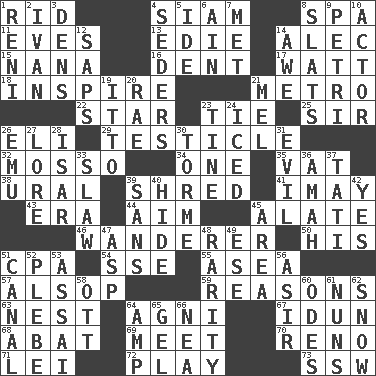 ACROSS 1. To free from 4. Thailand, formerly 8. Health resort 11. Nights before holidays 13. Singer Brickell 14. Actor Baldwin 15. Grandmother 16. Scratch 17. Electrical Unit 18. Heighten or intensify 21. Paris' subway 22. Play the lead 23. Make a knot 25. Title for a knight 26. Connecticut Ivy Leaguer 29. One of the two male reproductive glands 32. With motion or animation 34. Single 35. Large container 38. Mountain range 39. Fragment 41. "If ____ say so..." 43. Period 44. Direct toward a target or goal 45. Having winglike extensions 46. Nomad 50. Part of HMS, perhaps 51. Numbers guy (abbr.) 54. Compass dir. 55. At sea 57. Columnist Joseph or Stewart 59. Thinks logically 63. Egg locale 64. Hindu god of fire 67. Goddess of spring and wife of Bragi 68. Blind as ____ 69. Confront 70. Former U.S. Attorney General Janet 71. Flowery wreath 72. Live dramatic performance 73. Compass dir. DOWN 1. Painter Guido (1575-1642) 2. _ the terrible 3. Habitations of wild animals 4. Spring feasts 5. Binary compound 6. The 18th letter of the Arabic alphabet 7. Was introduced to 8. Narrow boards 9. _ dish (used to culture cells) 10. Thespian 12. Plant excrements 14. Deep reverence 19. "Tell ____ the Marines!" 20. Actress Charlotte 21. Cartoonist voice _ Blanc 23. Prong on a fork 24. On the rocks 26. Australian flightless bird 27. Old wives' tales, e.g. 28. Austrian river, tributary to the Danube 30. Singer Mel 31. Morally bad or wrong 33. Cole _ (cabbage dish) 36. Housemaid 37. Jacques of French films 39. Without 40. Flintstone garb 42. Consenting reply 45. Length times width 47. Viper 48. Noteworthy scarcity 49. Compass dir. 51. Lessep's creation 52. Cadet 53. Slender Brazilian palm 56. SW Saudi Arabia district 58. Baseball player Mel 60. Lyric poems 61. Religious women 62. Frozen precipitation 64. Electrical Unit 65. Set 66. Teachers' org.