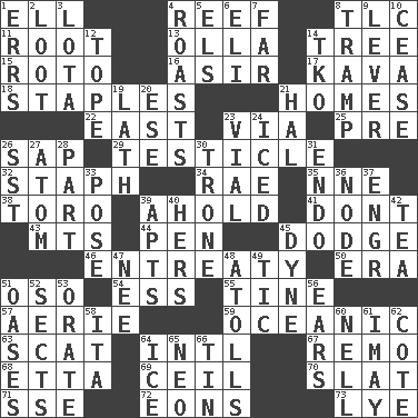 ACROSS 1. Pipe bend 4. Coral ridge 8. Affectionate concern, for short 11. Carrot, for example 13. Water jar 14. Woody plant 15. Printing process, for short 16. SW Saudi Arabia district 17. Polynesian shrub of the pepper family 18. Paper fasteners 21. Dwellings 22. Compass direction 23. By way of 25. Before (prefix) 26. Plant excrement 29. One of the two male reproductive glands 32. Staphylococcus 34. Actress Charlotte 35. Compass dir. 38. "Corrida" creature 39. Hold, grip (Informal) 41. Do not 43. Mountains (abbr.) 44. Animal enclosure 45. Evade 46. Plea 50. Period 51. Bear (Spanish) 54. Double-curved letter 55. Prong on a fork 57. Nest on high 59. Pertaining to the sea 63. Leave at once 64. International (abbr.) 67. San ____ (Riviera town) 68. Singer James 69. To provide with a ceiling 70. Narrow board 71. Compass dir. 72. Immeasurably long periods of time 73. Potassium hydroxide DOWN 1. Blunders 2. Plunder 3. Globular water bottle used in Asia 4. Cooks with dry heat, as in an oven 5. Raised railways 6. Biblical high priest 7. At a great distance 8. _____ steamer (cargo ship) 9. Prying instrument 10. Desist 12. Drink excessively 14. Ring climax 19. Thin strip of wood or metal 20. Compass dir. 21. Actor Linden 23. Small bottle 24. On the rocks 26. Fast jet (abbr.) 27. Tiny particle 28. Piece 30. Heavy duty weighing machine 31. Inside; within (prefix) 33. Introduce or present, as a question 36. Connecting point 37. Engineer (abbr.) 39. Flats, for short 40. Possessive pronoun 42. Beverage made from leaves 45. Centimeter-gram-second unit of force 47. Born 48. Ringlike coral islands and reefs 49. Nervous spasm 51. Fertile tracts in a desert 52. Religious groups 53. Declaim 56. Hearing organs 58. Call ___ day 60. 1994 drama film starring Jodie Foster 61. "If ____ say so..." 62. ____ d'Azur (French Riviera) 64. Frozen water 65. Modern: prefix 66. Metal container