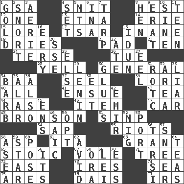 ACROSS 1. Girls' org. (abbr.) 4. Stricken, poetically 8. Behest 12. Single 13. Inactive volcano in Sicily 14. One of the Great Lakes 15. Old wives' tales, e.g. 17. Russian ruler of old 18. Empty; void 19. Frees from moisture 21. Writing tablet 23. Nine, plus one 24. Laconic 26. Third day of the wk. 28. Shout 30. Commissioned military rank 34. Sound made by sheep 37. Stitch closed the eyes of (a falcon) 39. Australian parrot (variant) 40. 100% 41. Follow as a consequence or result 43. Afternoon social gathering 44. To erase 46. A whole individual unit 47. Auto 48. "Death Wish" actor 51. Simple or foolish person 54. Plant excrement 55. Disturbances 58. Cleo's killer 61. Call ___ day 63. Let have 65. Unemotional 67. Short-tailed, large-bodied rat 71. Family _ (genealogy) 72. 90 degrees 73. Angers 74. Ocean 75. Ancient Greek god of war 76. Raised platform 77. Big collection agency DOWN 1. Gilded 2. Derisive sound 3. Nest on high 4. Arrange properly for use 5. Mountains (abbr.) 6. _ tizzy (2 wds.) 7. Canvas cover 8. Layer 9. Part of Q.E.F. 10. Trig term 11. Adolescent 16. Suggestive of the supernatural 18. Goddess of spring and wife of Bragi 20. Compass dir. 22. Had dinner 25. Otherwise 27. Snakelike fish 29. Soviet premier 1918-24 30. Cements 31. College mil. group 32. Length times width 33. One who doesn't tell the truth 34. Sharp remark 35. Having or resembling wings 36. In addition 38. Eastern Standard Time (abbr.) 42. Arab leader 45. Followers of ems 49. Ketch in the Levant 50. Choose 52. Russian fighter aircraft 53. Left side of a ship or aircraft 56. Tarsus (plural) 57. Scornful expression 58. Toward the sea 59. Play the lead 60. Introduce or present, as a question 62. Enthusiastic 64. Beverages made from leaves 66. ___ a Wonderful Life 68. Mouth or opening 69. Flowery wreath 70. Curvy letter