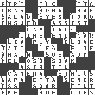 ACROSS 1. Corncob 5. Affectionate concern, for short 8. And so on (abbr.) 11. Mouths or openings 12. Israeli folk dance 14. Actress Charlotte 15. Vegetable dish 17. Snake ____ (dice throw) 18. "Corrida" creature 19. Took place subsequently 21. Help 23. Island 25. Baby powder 26. Welles in "The Third Man" 27. Australian flightless bird 28. Automobile 31. 54 in ancient Rome 33. Apply oneself diligently 35. Michael Jackson trademark 37. Jacques of French films 38. Part of a journey 40. Writer Wiesel 41. With great haste 43. Institute legal proceedings 45. Increase 46. Cartoonist voice _ Blanc 47. Bear (Spanish) 50. Neighbor of Neb. 52. SW Saudi Arabia district 53. Shallow baking pan 54. Device for capturing images 56. Moral principles 61. California wine valley 62. Singer James 65. Sir (Sp.) 66. Curvy letter 67. Fly high 68. Needle case 69. Make supply last 70. Regret 71. Chops off DOWN 1. Introduce or present, as a question 2. SW Asia republic 3. Friends 4. He sold his birthright 5. Definite Article 6. Myrna of the movies 7. Cause to be 8. Greek god of love 9. Small pie 10. Corporate head (abbr.) 13. Indian state 16. Tenth: prefix 18. Nervous spasm 20. Moist 22. A hard, heavy blow 24. Shout 26. 57 in ancient Rome 28. Chilled 29. Enthusiastic 30. To separate or throw off 31. Unable to walk 32. Slanted text style (abbr.) 34. Affirmative reply 36. Path through which fluid escapes 37. Scottish cap 39. Abrupt rush of wind 42. Characteristic smell of wine 44. Singer Brickell 48. Fathers 49. Speaker 51. Pismires 52. Nanny (var.) 54. Keg 55. Domed church section 57. The bottom of a shoe or boot 58. To the inside or interior of 59. Overturn; upset 60. Indian titles of respect 61. Born 63. The 19th letter of the Greek alphabet 64. "We ___ not amused" (Victoria)