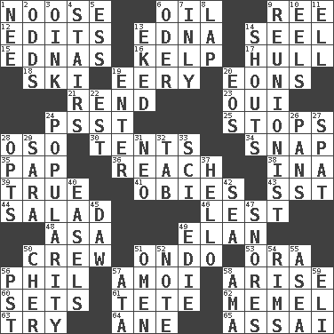ACROSS 1. Trap for birds or small mammals 6. Petroleum 9. Portuguese money of account (variant) 12. Prepares for publication 13. Pulitzer Prize-winning author Ferber 14. Sew up the eyelids of hawks and falcons 15. Ferber et al. 16. Seaweed 17. Frame or body of a ship 18. What Jean-Claude Killy likes to do 19. Suggestive of the supernatural 20. Immeasurably long periods of time 21. Tear apart 23. Fr. "Yes" 24. Inconspicuous attention getter 25. Obstructs or blocks passage 28. Bear (Spanish) 30. Portable shelters 34. Fastener 35. Infant food 36. Arrive at 38. _ tizzy (2 wds.) 39. Loyal 41. Off-Broadway awards 43. Fast jet (abbr.) 44. Vegetable dish 46. For fear that 48. White ___ sheet 49. Style 50. Group working together 51. Southwest Nigerian state 53. Mouth or opening 56. Silvers or Donahue 57. Mine, in Marseilles 58. Originate 60. Arranges properly for use 61. False hair 62. Klaipeda city 63. Attempt to accomplish something 64. One (Scot) 65. Slender Brazilian palm DOWN 1. Born 2. Likelihood 3. Pig sound 4. Flight of steps 5. Curvy letter 6. River in Europe 7. In an inward manner 8. Infant locale 9. One who advocates reunion 10. Snakelike fish 11. Pipe bend 13. Made supply last 14. Yells 19. Keyboard key 20. Greek goddess of the dawn 22. Eastern Standard Time (abbr.) 24. Teen's desire 26. Zero-star reviews 27. Petty quarrel 28. Chooses 29. "Two Mules for Sister ____" 31. Modern: prefix 32. Keyboard key 33. _-fi 37. Phone greeting 40. Artist's stands 42. Ocean 45. Fool 47. Sounds asleep 49. Singer Brickell 50. "Mermaids" star 51. Presage 52. Brief written record 54. Basketball hoops 55. Toward the sea 56. Pacific Standard Time (abbr.) 57. _ moment's notice (2 wds.) 58. Nursemaid (var.) 59. Connecticut Ivy Leaguer