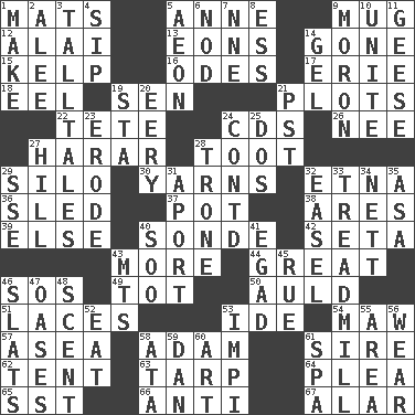 ACROSS 1. Floor coverings 5. Queen of England 1702-14 9. Java container 12. Jai ____ 13. Immeasurably long periods of time 14. Went 15. Seaweed 16. Lyric poems 17. One of the Great Lakes 18. Snakelike fish 19. Elected rep. 21. Graphs 22. Wig 24. Music discs 26. Born 27. Ethiopian city, capital of Harari 28. A blast of a horn 29. Grain storage tower 30. Entertaining tales 32. Inactive volcano in Sicily 36. Downhill vehicle 37. Plant holder 38. Ancient Greek god of war 39. Otherwise 40. Something which is sent 42. Bristle 43. Greater amount 44. Relatively large 46. Mayday 49. Small child 50. Old (Scot.) 51. Shoestrings 53. Binary compound 54. Informal term for the mouth 57. At sea 58. First man 61. Title for a man of rank and authority 62. Portable shelter 63. Canvas cover 64. Entreaty 65. Fast jet (abbr.) 66. Against 67. Having or resembling wings DOWN 1. Create 2. Toward shelter 3. Baron Munchausen's specialties 4. Small drink 5. A really long time 6. Lower and raise head in agreement 7. Compass dir. 8. Curvy letter 9. Person of subnormal intelligence 10. Join together 11. Honkers 14. Set 19. R.R. building 20. Suggestive of the supernatural 21. Pacific Standard Time (abbr.) 23. Eat (away) 24. Continued (abbr.) 25. Two (Sp.) 27. Land elevation 28. Marketplace scale 29. Compass dir. 31. To the left, to Queeg 32. Artist's stand 33. Excercise machine 34. Remaining after all deductions 35. White ___ sheet 40. "Barney Miller" actor Jack 41. Mild oath 43. Mountains (abbr.) 45. Regret 46. Narrow boards 47. Fertile tracts in a desert 48. Aroma 52. Erode 53. Body of Kaffir warriors 55. Type of rug 56. Put on (as clothing) 58. _ moment's notice (2 wds.) 59. One of the 12 tribes of Israel 60. Tate display 61. Health resort