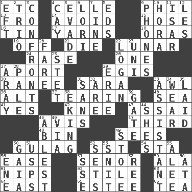 ACROSS 1. And so on (abbr.) 4. Cell (Danish) 9. Silvers or Donahue 13. From 14. Prevent from happening 15. Flexible conduit 16. Shallow baking pan 17. Tall tales 18. Mouths or openings 19. No longer planned or scheduled 21. Pass on 22. Type of eclipse 24. Raze (variant) 26. Single 27. To the left, to Queeg 29. Armor plate that protects the chest 30. The wife of a rajah (variant) 31. "Two Mules for Sister ____" 33. Leather borer 36. Keyboard modifier key 37. Pulling apart 40. Ocean 41. It is so 42. Leg joint 43. Slender Brazilian palm 45. Opinion 47. One of three equal parts 48. Storage container 49. Observes 50. POW camp 52. Fast jet (abbr.) 54. R.R. building 56. Comfort 57. Sir (Sp.) 59. In the manner of 61. Cuts off 62. Vertical member of a panel or frame 63. Fish or hair follower 64. 90 degrees 65. First name in cosmetics 66. Afternoon social gathering DOWN 1. Bank Draft (abbr.) 2. Musical group of three 3. Meets 4. Island 5. Dodge 6. Australian parrot (variant) 7. Actor's bit 8. Begley and Asner 9. Gives a jingle 10. Israeli folk dance 11. Austrian river, tributary to the Danube 12. French article 20. Conductor's collection 22. Utah city north of Ogden 23. Single; one (prefix) 25. Proofreading order 27. Like ___ of sunshine 28. Diluted with white 29. One of the Great Lakes 31. Without 32. "We ___ not amused" (Victoria) 33. Aide 34. Erode 35. Put down 38. Supplementing with great effort 39. Yard entry 44. "______ My Girl" (Turtles hit) 45. Most capable 46. By way of 49. Took without asking 50. Greek goddess of the earth (variant) 51. United States Postal Service (abbr.) 52. Puts into a specified state 53. In a ____ (agitated or irritated) 55. Toward shelter 56. Compass dir. 57. Compass dir. 58. To sift 60. "One Day ___ Time"