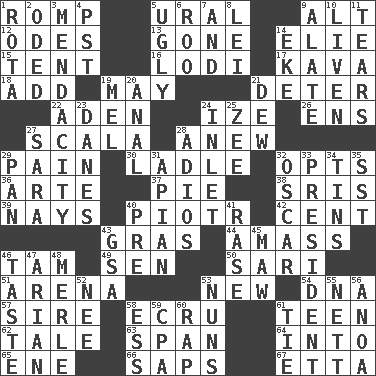 ACROSS 1. Play 5. Mountain range 9. The first octave above the treble staff 12. Lyric poems 13. Went 14. Writer Wiesel 15. Portable shelter 16. Farming town in central California 17. Polynesian shrub of the pepper family 18. Increase 19. Can I? 21. Prevent from occurring 22. An important port of Yemen 24. Ending with capital 26. Followers of ems 27. Any of the three canals of the cochlea 28. Afresh 29. Ache 30. Dipping utensil 32. Chooses 36. Johnson of "Laugh-In" 37. Sliced dessert 38. Indian titles of respect 39. Negative votes 40. Peter (Polish) 42. Penny 43. Pate de foie ____ 44. Collect or gather 46. Scottish cap 49. Elected rep. 50. Indian skirt 51. Sports stadium 53. ___ Haven, CT 54. Heredity factor (abbr.) 57. Title for a man of rank and authority 58. Shade of tan 61. Adolescent 62. Falsehood 63. Connect, as a bridge 64. To the inside or interior of 65. Compass dir. 66. Plant excrements 67. Singer James DOWN 1. Round or rotation of duties 2. Wrote a lyric poem 3. Ananias' fault 4. Pacific Standard Time (abbr.) 5. Repulsive 6. Friend of Pooh 7. Added to 8. Flowery wreath 9. Having winglike extensions 10. Make or become more lively 11. Rends 14. Supplement with great effort 19. Cartoonist voice _ Blanc 20. Of or related to the anus 21. Morning condensation 23. Natives or inhabitants of Denmark 24. An arm off of a larger body of water 25. Last letter of the English alphabet 27. "Two Mules for Sister ____" 28. Goodbye (Sp.) 29. Baking dish 31. Bee-related 32. Motion picture award 33. Elected leader of a country 34. Canisters 35. Fast jet (abbr.) 40. Before (prefix) 41. Raze (variant) 43. Girls' org. (abbr.) 45. Opening into something insatiable 46. Clothes sense 47. Believer in; advocate of (suffix) 48. Haggard of country music 52. Born 53. Religious women 55. Remaining after all deductions 56. Small Philippine buffalo 58. Double-curved letter 59. Accounting whiz (abbr.) 60. Strike 61. Make a knot