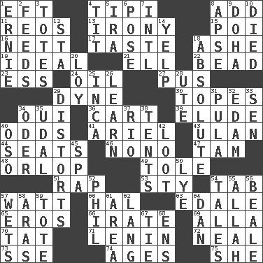 ACROSS 1. Bank Draft (abbr.) 4. Native american tent (variation) 8. Find the sum of 11. Vintage cars 13. Literary sarcasm 15. Luau course 16. Remaining after all deductions 17. Clothes sense 18. American tennis player Robert 19. Standard of perfection 21. Pipe bend 22. Necklace unit 23. Double-curved letter 24. Petroleum 27. Tenth month of the Hindu calendar 29. Unit of force 30. Drinks excessively 34. Fr. "Yes" 36. Heavy open wagon 39. Dodge 40. Likelihood 41. Satellite of Uranus 43. ____ Bator, Mongolia 44. Theater features 46. Words to Nanette 47. Scottish cap 48. Fourth or lowest deck 49. Lacquered or enameled metalware 51. Strike 53. Filthy place 54. Bar bill 57. Electrical Unit 60. Actor Linden 63. Peak District village in England 65. Greek god of love 66. Feeling or showing extreme anger 69. Silent film actress Nazimova 70. Make lace 71. Soviet premier 1918-24 72. Anneal 73. Compass dir. 74. Ripens 75. A female animal or person DOWN 1. Bert's buddy 2. Eats 3. Hauls 4. Teat (slang) 5. Lyricist Gershwin 6. Airs 7. International (abbr.) 8. Domed church section 9. Capital of the state of Qatar 10. Passed on 12. R.R. building 14. Sharp bark 18. Utter; complete 20. Myrna of the movies 25. South American Indian 26. Acquire or gain knowledge or skills 28. Shoshoni 29. What propaganda does 31. Monetary unit of Botswana 32. Dutch treat 33. Elected rep. 34. Baltic tributary 35. Freehold land 37. _ de Janeiro 38. Portable shelters 40. Bear (Spanish) 42. Spoils 45. Health resort 50. Potassium hydroxide 52. Silvers or Donahue 54. Stories 55. Assad's deity 56. Calif. Air Force Base 57. Soaks 58. Ancient river in northeast Turkey 59. Carry 61. Type of rug 62. Long (Scottish) 64. Daniel's nick name 67. Make a knot 68. Followers of ems
