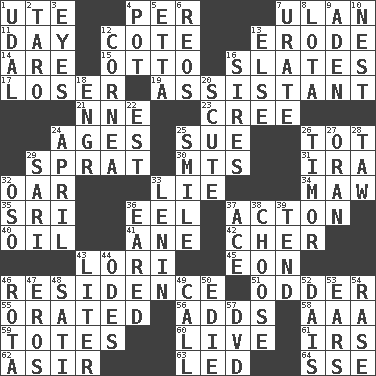 ACROSS 1. Shoshoni 4. For each 7. ____ Bator, Mongolia 11. 24 hours 12. ____ d'Azur (French Riviera) 13. Wear away 14. "We ___ not amused" (Victoria) 15. Von Bismarck 16. Chalkboards 17. Failure 19. Helper 21. Compass dir. 23. Algonquian 24. Matures 25. Take to court 26. Small child 29. Small fatty European fish 30. Mountains (abbr.) 31. Lyricist Gershwin 32. Rowing implement 33. Untruth 34. Opening into something insatiable 35. _ Lanka 36. Snakelike fish 37. 13-14th century defensive garment 40. Petroleum 41. One (Scot) 42. "Mermaids" star 43. Australian parrot (variant) 45. Age 46. Dwelling 51. More peculiar 55. Spoke pompously 56. Sums up 58. American Automobile Association (abbr.) 59. Hauls 60. Moving, as bait 61. Big collection agency 62. SW Saudi Arabia district 63. Directed 64. Compass dir. DOWN 1. Freehold land 2. Pacific island yam 3. Sight organs 4. Plant holder 5. Singer James 6. Vintage cars 7. A salt of uric acid 8. Globular water bottle used in Asia 9. An important port of Yemen 10. Egg locale 12. Pupil covering 13. Otherwise 16. Titles for men of rank and authority 18. Engineer (abbr.) 20. Turtle shell scale 22. Eastern Standard Time (abbr.) 24. Showery time 25. Grin 26. The easternmost of the Lesser Sundas 27. NW Algerian seaport 28. The 23rd letter of the Hebrew alphabet 29. Indian skirt 32. Bear (Spanish) 33. Soviet premier 1918-24 36. Having ears or earlike features 37. Adept person 38. Elect 39. Watch over 43. 61 cubic inches 44. Lyric poems 46. Roll call or roster of names 47. Greek god of love 48. Suttee (variant) 49. Give a ring to 50. Singer Brickell 52. Raised platform 53. Hearing organs 54. To erase 57. Movie disc