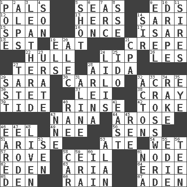 ACROSS 1. Friends 5. Oceans 9. Begley and Asner 12. Margarine 13. Possessive pronoun 14. Indian skirt 15. Connect, as a bridge 16. Single time 17. Austrian river, tributary to the Danube 18. Eastern Standard Time (abbr.) 19. Ingest 21. Streamer paper 22. Frame or body of a ship 24. Mouth edge 26. French article 27. Laconic 28. Opera by Verdi 29. "Two Mules for Sister ____" 30. Monte _, Las Vegas Hotel/Casino 32. Measure of real estate 36. Proofreading order 37. Luau accessory 38. Supercomputer manufacturer 39. Periodic rise and fall of the sea level 40. Remove soap 42. Puff or smoke 43. Nanny 44. Came up 46. Snakelike fish 49. Born 50. Elected reps. 51. Get up 53. Had dinner 54. Soggy 57. Be footloose 58. To provide with a ceiling 61. Connecting point 62. Genesis locale 63. Operatic vocal solo 64. 4th largest of the Great Lakes 65. Lair 66. Precipitation 67. An important port of Yemen DOWN 1. Airs 2. High mountains 3. Tough but pliablecoriaceous 4. Male offspring 5. Guess 6. Car or cant ending 7. Curve 8. Compass dir. 9. Artist's stand 10. Window treatment 11. Fathers 14. Title for a knight 19. Raised railways 20. Actor Baldwin 21. Numbers guy (abbr.) 23. A salt of uric acid 24. Ms. Damita and namesakes 25. Wedding promise 27. Jacques of French films 28. Sports stadium 29. Fast jet (abbr.) 31. Place in a line 32. 13-14th century defensive garment 33. What you're doing now 34. Libertine 35. Sight organ 40. Actress Charlotte 41. 90 degrees 43. Compass dir. 45. To separate or throw off 46. Having ears or earlike features 47. Eat (away) 48. Make or become more lively 52. Elected rep. 53. ____ Jay Lerner 55. Singer Brickell 56. Adolescent 58. Auto 59. Epoch 60. One more than two 61. Teachers' org.