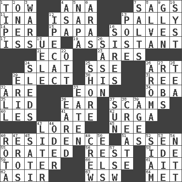 ACROSS 1. Pull behind 4. Santa ___, CA 7. Droops 11. _ tizzy (2 wds.) 12. Austrian river, tributary to the Danube 13. Chummy 14. For each 15. Dad 16. Finds the solution 17. Come out of 19. Helper 21. Environmental prefix 23. Ancient Greek god of war 24. Narrow board 25. Compass dir. 26. Tate display 29. Voters do this 30. Part of HMS, perhaps 31. To riddle 32. "We ___ not amused" (Victoria) 33. Period of immesurable duration 34. Chief or king in Benin or Nigeria 35. Flaplike covering 36. Ewer handle 37. Fraudulent business schemes 40. French article 41. Had dinner 42. Capital and largest city of Mongolia 43. Old wives' tales, e.g. 45. Born 46. Dwelling 51. NE Netherlands city 55. Spoke pompously 56. Respite 58. Binary compound 59. Carrier 60. Otherwise 61. Small island 62. SW Saudi Arabia district 63. Compass dir. 64. Was introduced to DOWN 1. Native american tent (variation) 2. Washington bills 3. Armed conflicts 4. White ___ sheet 5. California wine valley 6. Ancient river in northeast Turkey 7. Table seasonings 8. Inventor's middle name 9. Small, secluded valley 10. System (abbr.) 12. Medicinal drug used to evoke vomiting 13. Introduce or present, as a question 16. Male parents of animals 18. Ubangi River tributary 20. Indian antelope 22. Baseball player Mel 24. Bobsleighs 25. Dinah or Pauly 26. Odor 27. Confederate soldiers (slang) 28. Afternoon social gathering 29. 4th largest of the Great Lakes 32. 100% 33. Ingested 36. Having ears or earlike features 37. Player for Phoenix 38. Cause to be 39. Ripens 43. 61 cubic inches 44. River in Europe 46. Roll call or roster of names 47. Greek god of love 48. Suttee (variant) 49. Group working together 50. Snakelike fish 52. Thailand, formerly 53. Singer Brickell 54. Remaining after all deductions 57. Compass dir.