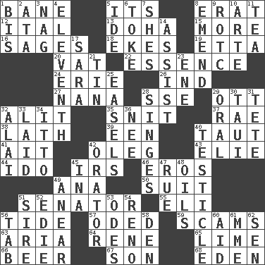 ACROSS 1. Object of repulsion 5. ___ a Wonderful Life 8. Part of Q.E.F. 12. Slanted text style (abbr.) 13. Capital of the state of Qatar 15. Greater amount 16. Gurus 18. Supplements with great effort 19. Singer James 20. Large container 22. Center 24. 4th largest of the Great Lakes 26. Working for oneself (abbr.) 27. Grandmother 28. Compass dir. 29. Baseball player Mel 32. Set down 35. In a ____ (agitated or irritated) 37. Actress Charlotte 38. Thin strip of wood or metal 39. Car or cant ending 40. Drawn tight 41. Small island 42. Cassini of fashion 43. Writer Wiesel 44. Wedding promise 45. Big collection agency 46. Greek god of love 49. Santa ___, CA 50. Set or collection 51. Elected representative 55. Connecticut Ivy Leaguer 56. Periodic rise and fall of the sea level 57. Wrote a lyric poem 59. Fraudulent business schemes 63. Operatic vocal solo 64. French philosopher Descartes 65. Welles in "The Third Man" 66. Fermented drink made from hops 67. Male offspring 68. Paradise DOWN 1. Again 2. "One Day ___ Time" 3. Tired old horse 4. Veterans Day date 5. Binary compound 6. Puff or smoke 7. "______ My Girl" (Turtles hit) 8. Make improvements or corrections to 9. College mil. group 10. Johnson of "Laugh-In" 11. Afternoon social gathering 14. Aid 17. "Two Mules for Sister ____" 21. Shallow baking pan 23. Compass dir. 25. Artist's stands 28. Burns superficially 29. Spoken 30. "Change" in Tahitian 31. Wig 32. Jai ____ 33. Put down 34. "Tell ____ the Marines!" 36. Born 40. One of the two male reproductive glands 42. Speaker 45. _ tizzy (2 wds.) 47. Regret 48. Petroleums 49. Approach 51. Title for a man of rank and authority 52. Singer Brickell 53. Lyric poems 54. Former U.S. Attorney General Janet 56. Bar bill 58. Lair 60. Help 61. Madame (abbr.) 62. Elected rep.