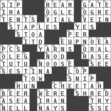 ACROSS 1. Small drink 4. 480, 500 or 516 sheets of paper 8. Yard entry 12. Retirement account (abbr.) 13. Stare 14. Legendary monster 15. Portable shelters 18. Small bottle 19. Distinctive style or manner 20. Paper fasteners 22. Consenting reply 23. Portico 24. For each 25. It would 26. Normal relaxed breathing 30. Personal Computers (abbr.) 33. Entertaining tales 36. Taken by mouth 37. Cassini of fashion 39. Lower and raise head in agreement 40. Raze (variant) 41. Ballerina skirt 42. Trap for birds or small mammals 44. Observe 45. French poetic form 47. Trim (branches) 50. Pull behind 51. Clip 53. Attila the _ 54. Leopard's kin 57. Fermented drink made from hops 59. We are 61. Tear up 63. At sea 64. SW Asia republic 65. Attempt to accomplish something 66. 1994 drama film starring Jodie Foster 67. Negative votes 68. Compass dir. DOWN 1. Be seated 2. Angers 3. Leg coverings 4. Be footloose 5. Armor plate that protects the chest 6. In the manner of 7. Cartoonist voice _ Blanc 8. Head of state? 9. Eras 10. Three (prefix) 11. Car or cant ending 16. Jacques of French films 17. Blemish 21. Kenny Rogers chart-topper in '80 22. Slangy assent 24. Ichor 26. Extremities 27. Mouths or openings 28. Relaxation 29. Toward shelter 30. Cooking vessels 31. A slight indication 32. Arranges properly for use 34. Small Philippine buffalo 35. Friend of Pooh 38. From the throat 42. Compass dir. 43. Otherwise 46. Electrically charged atom 48. Washington bills 49. Essential or central part 52. Actors' quests 53. Person who is morally reprehensible 54. Supercomputer manufacturer 55. Coop moms 56. Possessive pronoun 57. Forbid 58. Compass dir. 59. Victory 60. Period 62. Color