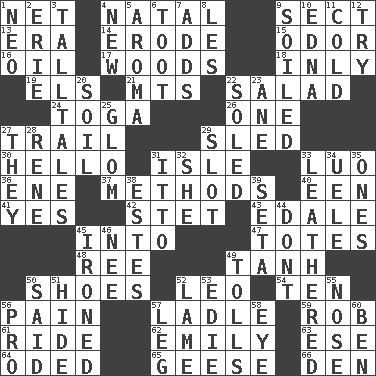 ACROSS 1. Fish or hair follower 4. Relating to or accompanying birth 9. Religious group 13. Period 14. Eat (away) 15. Scent 16. Lubricate 17. Forest 18. In an inward manner 19. Raised railways 21. Mountains (abbr.) 22. First course 24. Ancient Roman robe 26. Single 27. Hang back 29. Downhill vehicle 30. Phone greeting 31. Small island 33. Nilotic language 36. Compass dir. 37. Modes 40. Car or cant ending 41. Consenting reply 42. Proofreading order 43. Peak District village in England 45. To the inside or interior of 47. Hauls 48. To sift 49. Hyperbolic tangent 50. Imelda's hoard 52. Lion 54. Nine, plus one 56. Ache 57. Dipping utensil 59. Director Reiner 61. Travel on an animal 62. Poet Dickinson 63. Compass dir. 64. Wrote a lyric poem 65. Honkers 66. Lair DOWN 1. Modern: prefix 2. One of the Great Lakes 3. Baron Munchausen's specialties 4. ___ Haven, CT 5. Odor 6. A blast of a horn 7. Sums up 8. French article 9. Dirtied 10. Pulitzer Prize-winning author Ferber 11. Chilled 12. Attempt 20. Land 22. Having a sole or soles 23. One (Scot) 25. Seize upon or latch onto something 27. Those people 28. French philosopher Descartes 29. Position in a hierarchy or organization 31. "Tell ____ the Marines!" 32. A female animal or person 33. Resembling or made to resemble leather 34. Ubangi River tributary 35. Singles 38. _____ Park, CO 39. Stalk of a moss capsule 44. Do not 45. Pressed 46. Born 49. For Whom the Bell _____ 50. Alleged 51. Flintstone garb 52. Unable to walk 53. Singer Brickell 55. Characteristic smell of wine 56. Adept person 57. Part of a journey 58. Sight organ 60. Benjamin's nick name