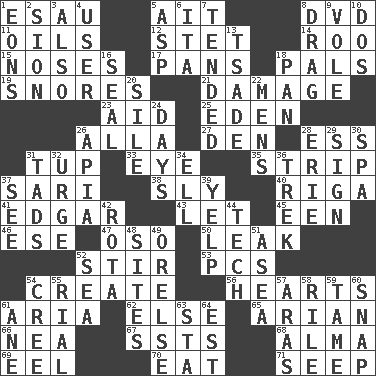 ACROSS 1. He sold his birthright 5. Small island 8. Movie disc 11. Lubricates 12. Proofreading order 14. Friend of Pooh 15. Olfactory organs 17. Zero-star reviews 18. Friends 19. Sounds asleep 21. Break 23. Assist 25. Locale of original sin 26. Silent film actress Nazimova 27. Lair 28. Curvy letter 31. Uncastrated adult male sheep 33. Sight organ 35. Long narrow piece of something 37. Indian skirt 38. Cunning 40. Port city in Latvia 41. _ Allan Poe 43. Allow 45. Car or cant ending 46. Compass dir. 47. Bear (Spanish) 50. Path through which fluid escapes 52. Commotion 53. Personal Computers (abbr.) 54. Cause to be 56. Centers of feelings and intuitions 61. Roberta Peters solo 62. Otherwise 65. Believer in; advocate of (suffix) 66. Teachers' org. 67. Fast planes 68. _ mater 69. Snakelike fish 70. Ingest 71. Ooze DOWN 1. Immeasurably long periods of time 2. The Jewish people; Israel 3. In addition 4. One who uses or employs something 5. Cleo's killer 6. Call ___ day 7. Watched over 8. To be drawn or hauled along 9. Grand slam 10. Two (Sp.) 13. Sadhe (variant) 16. Lick closed 18. Baking dish 20. Filth; sediment 22. Not women's 24. 24-hour periods 26. Capital of Western Samoa 28. 4th largest of the Great Lakes 29. Signal 30. Health resort 31. Small boys 32. Goad 34. Pipe bend 36. Long journey 37. Perceive with the eye 39. Sharp bark 42. Roll call or roster of names 44. Technician 48. Settings 49. Threatening words 51. At sea 52. Ocean 54. Algonquian 55. Monetary unit of Yemen 57. Caspian sea tributary 58. Cause heat under the collar 59. Not wild 60. Fastener 61. A saturated hydrocarbon 63. R.R. building 64. Eastern Standard Time (abbr.)