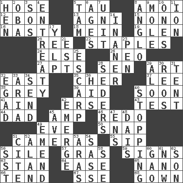 ACROSS 1. Flexible conduit 5. The 19th letter of the Greek alphabet 8. Mine, in Marseilles 12. Inky black, to poets 13. Hindu god of fire 15. Words to Nanette 16. Difficult 18. Chow _ 19. Small, secluded valley 20. To riddle 22. Paper fasteners 24. Otherwise 26. Modern: prefix 27. Tenement units (abbr.) 28. Elected rep. 29. Nonscientific branch of learning 32. Compass direction 35. "Mermaids" star 37. Area sheltered from the wind 38. Jennifer or Joel 39. Assist 40. Within a short period 41. The 18th letter of the Arabic alphabet 42. Celtic language 43. Trial 44. Male parent 45. Electrical Unit 46. Redecorate 49. Night before a holiday 50. Fastener 51. Devices for capturing images 55. Small drink 56. Filth; sediment 57. Pate de foie ____ 59. Omens 63. Comedian Laurel of Laurel & Hardy 64. Relaxation 65. Billionth: prefix 66. Be inclined (to) 67. Compass dir. 68. Long dress DOWN 1. Layer 2. Chief or king in Benin or Nigeria 3. Mayday 4. Plea 5. Scottish cap 6. Eras 7. A single undivided whole 8. White American of non-Hispanic descent 9. Undercover agent 10. Washington bills 11. Electrically charged atom 14. Sillier 17. Sharp bark 21. Eastern Standard Time (abbr.) 23. Fenced enclosure 25. Fortification 28. Spring feasts 29. _ vera 30. Vintage cars 31. Portable shelter 32. Mild oath 33. Operatic vocal solo 34. Transmit 36. Part of HMS, perhaps 40. Obstructing or blocking passage 42. Develop 45. "___ Maria" 47. Followers of ems 48. Raised platform 49. Make improvements or corrections to 51. Quote 52. Actor Alda or Thicke 53. Ancient river in northeast Turkey 54. Backtalk 56. Fast jet (abbr.) 58. Perceive with the eye 60. E Mali city 61. Compass dir. 62. Boy, to dad