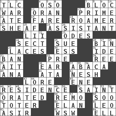 ACROSS 1. Affectionate concern, for short 4. Bear (Spanish) 7. Group of countries in special alliance 11. Armed conflict 12. Northwest Algerian city 13. First class 14. Had dinner 15. Conductor's collection 16. Wanderer 17. Bundle of cut stalks of grain 19. Aide 21. Cards in a Roman deck? 23. Lyric poems 24. Religious group 25. Take to court 26. Storage container 29. Shoestrings 30. Double-curved letter 31. Binary compound 32. Forbid 33. Before (prefix) 34. To separate or throw off 35. Small island 36. Hearing organ 37. Phillipine bananalike plant 40. Santa ___, CA 41. _ moment's notice (2 wds.) 42. Tender 43. Old wives' tales, e.g. 45. Compass dir. 46. Home 51. Virtuous person 55. Spoke pompously 56. San ____ (Riviera town) 58. "Barney Miller" actor Jack 59. Carrier 60. Enthusiasm 61. Lion 62. SW Saudi Arabia district 63. Compass dir. 64. Pipe bend DOWN 1. It was, poetically 2. Thin strip of wood or metal 3. Algonquian 4. Mouth or opening 5. "Two Mules for Sister ____" 6. Singles 7. Naughty children 8. Pale green bean 9. Presage 10. Sure thing 12. Public position 13. Introduce or present, as a question 16. Amusement-park features 18. Actor Baldwin 20. Lush 22. It is 24. Before Barbara or Clara 25. Father Junipero _ 26. A tree used for making furniture 27. It may be bright or harebrained 28. Born 29. (Had) reclined 32. Sound made by sheep 33. Eucharist need 36. Having ears or earlike features 37. One (Scot) 38. Gillaume's butler role 39. Toward the sea 43. 61 cubic inches 44. Baltic tributary 46. Round or rotation of duties 47. Greek god of love 48. Suttee (variant) 49. Ship's personnel 50. Snakelike fish 52. Capri or Wight 53. Christmas carol 54. Utensil 57. Opening into something insatiable