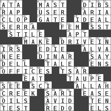 ACROSS 1. "One Day ___ Time" 4. Vertical spar for supporting sails 8. Claim 12. Strike 13. One who makes use of a thing 14. Operatic vocal solo 15. Hoof sound 17. Yard entry 18. Standard of perfection 19. Father Junipero _ 21. Opposite of masc. 23. Fast jet (abbr.) 24. Vertical member of a panel or frame 26. Fitting 28. Cause to be 30. Popular '50s hangout 34. Big collection agency 37. Singer Brickell 39. Inventor's middle name 40. Born 41. Middle Eastern gold or silver currency 43. Declare 44. Small valley 46. Falsehood 47. Followers of ems 48. Places of business 51. Russian ruler of old 54. Erode 55. Grayish beige 58. Observe 61. _-fi 63. Assad's deity 65. Small stream 67. Indian skirt 71. Comfort 72. Petroleums 73. Enthusiastic 74. Nine, plus one 75. Trial 76. Do over again 77. Raised railways DOWN 1. Arches 2. Lies 3. To the left, to Queeg 4. Large cup 5. White ___ sheet 6. Put into a specified state 7. Not kosher 8. Male parent 9. Angers 10. Prejudice 11. Table seasoning 16. Demure 18. Body of Kaffir warriors 20. In the manner of 22. Ewer handle 25. Supplemented with great effort 27. Federal power corp. 29. Proofreads 30. Started a card game 31. Otherwise 32. "Terrible" tsar 33. Negative votes 34. _ china 35. Coral collection 36. Automatic 38. _ tizzy (2 wds.) 42. Respite 45. Untruth 49. Keg 50. And so on (abbr.) 52. American Automobile Association (abbr.) 53. Governing power 56. Food holder 57. Artist's stand 58. Native of Scotland 59. One of the Great Lakes 60. Snakelike fish 62. Austrian river, tributary to the Danube 64. Coop moms 66. Eastern Standard Time (abbr.) 68. "___ Maria" 69. To free from 70. Wedding promise