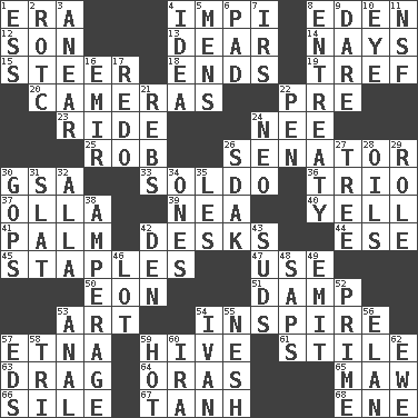 ACROSS 1. Period 4. Body of Kaffir warriors 8. Genesis locale 12. Male child 13. Letter starter 14. Negative votes 15. Guide 18. Conclusions 19. Not kosher 20. Devices for capturing images 22. Before (prefix) 23. Travel on an animal 24. Born 25. Director Reiner 26. Legislator 30. Girls' org. (abbr.) 33. Twentieth part of a lira 36. Musical group of three 37. Rounded earthenware pot or jar 39. Teachers' org. 40. Shout 41. Inside of hand 42. Writing tables 44. Compass dir. 45. Paper fasteners 47. Purpose 50. Age 51. Moist 53. Nonscientific branch of learning 54. Heighten or intensify 57. Inactive volcano in Sicily 59. Hub of activity 61. Vertical member of a panel or frame 63. To trail on the ground 64. Mouths or openings 65. Informal term for the mouth 66. Filth; sediment 67. Hyperbolic tangent 68. Compass dir. DOWN 1. Curvy letter 2. College mil. group 3. Approach 4. The content of cognition 5. Not women's 6. Groovy apt. 7. Big collection agency 8. Plea 9. Have the gumption 10. Sight organ 11. Overdraft (abbr.) 16. Independent ruler or chieftain 17. Make new 21. Confederate soldiers (slang) 22. Animal enclosure 24. Modern: prefix 26. Neighbor of Neb. 27. Woody plant 28. Lubricates 29. Hero or heavy, e.g. 30. Republicans 31. Narrow board 32. Silent film actress Nazimova 34. Singles 35. French article 38. Electrical Measurement 42. Lair 43. Soap bubbles 46. Car dealer's back yard 48. Plant excrements 49. Send forth 52. A-one 53. Of or related to the anus 54. "Terrible" tsar 55. Soft 56. Enthusiasm 57. Begley and Asner 58. Three (prefix) 59. Being at a high temperature 60. Retirement account (abbr.) 62. She-sheep