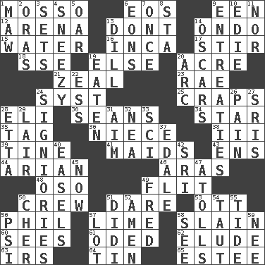 ACROSS 1. With motion or animation 6. Greek goddess of the dawn 9. Car or cant ending 12. Sports stadium 13. Do not 14. Southwest Nigerian state 15. Wetness 16. South American Indian 17. Use a spoon 18. Compass dir. 19. Otherwise 20. 1/640 square mile 21. Ardor 23. Actress Charlotte 24. System (abbr.) 25. Dice game 28. Connecticut Ivy Leaguer 30. Actors Connery and Penn 34. Play the lead 35. Label 36. Sibling's daughter 38. One more than two 39. Prong on a fork 41. Women servants 43. Followers of ems 44. Believer in; advocate of (suffix) 46. Caspian sea tributary 48. Bear (Spanish) 49. Sudden quick movement 50. Group working together 51. Have the gumption 53. Baseball player Mel 56. Silvers or Donahue 57. Welles in "The Third Man" 58. Killed 60. Perceives with the eye 61. Wrote a lyric poem 62. Evade 63. Big collection agency 64. Metal container 65. First name in cosmetics DOWN 1. Opening into something insatiable 2. Mouths or openings 3. Arranges properly for use 4. Dwarf with a sinus problem 5. Boat paddle 6. Immeasurably long periods of time 7. Single time 8. R.R. building 9. Pleas 10. Singer Brickell 11. Or not 13. Deli pickle 14. Motion picture awards 19. Ingested 20. Curve 22. Curvy letter 24. Seigniories (variant) 26. Ache 27. Indian titles of respect 28. Singer James 29. Den 31. Direct toward a target or goal 32. Teachers' org. 33. _-fi 37. Peak District village in England 40. Artist's stands 42. Indian title of respect (Mr.) 45. Immediately 47. Ringlike coral islands and reefs 49. Flintstone 50. "Mermaids" star 51. "You Light Up My Life" star Conn 52. So be it 54. Strained 55. Event that recurs at intervals 56. 23rd letter of the Greek alphabet 57. Car dealer's back yard 58. Perceive with the eye 59. Born