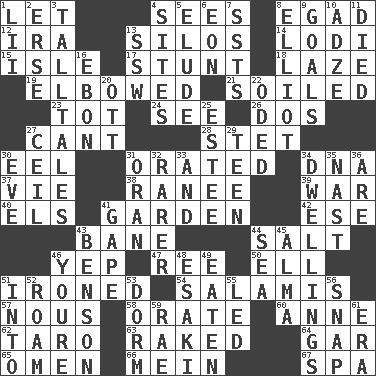 ACROSS 1. Allow 4. Perceives with the eye 8. Mild oath 12. Retirement account (abbr.) 13. Grain storage towers 14. Farming town in central California 15. Capri or Wight 17. Check the growth or development of 18. Goldbrick 19. Turned at an angle; bent 21. Dirtied 23. Small child 24. Observe 26. Two (Sp.) 27. Patter 28. Proofreading order 30. Snakelike fish 31. Declaimed 34. Heredity factor (abbr.) 37. Compete 38. The wife of a rajah (variant) 39. Armed conflict 40. Raised railways 41. Place where plants grow 42. Compass dir. 43. Object of repulsion 44. Table seasoning 46. Slangy assent 47. To riddle 50. Pipe bend 51. Pressed 54. Deli grouping 57. Good sense 58. Speak pompously 60. Queen of England 1702-14 62. Pacific island yam 63. Moved through 64. Slender fish 65. Sign of things to come 66. Chow _ 67. Health resort DOWN 1. Cards in a Roman deck? 2. Celtic language 3. Baron Munchausen's specialties 4. Locates 5. Evade 6. Age 7. Fast planes 8. American author Paul (1891-1958) 9. Scores awarded for successful feats 10. Edge tool used to cut and shape wood 11. Passed on 13. Compass dir. 16. Inky black, to poets 20. Baseball player Mel 22. Wrote a lyric poem 25. First name in cosmetics 27. To provide with a ceiling 29. Adolescent 30. First lady 31. Northwest Algerian city 32. Less widely known 33. Added to 34. Residences 35. Political cartoonist Thomas 36. "We ___ not amused" (Victoria) 41. Open wide 43. Gillaume's butler role 44. Ocean 45. _ mater 46. You are 48. 1973 Nobel Price Winner (Physics) Leo 49. Ingested 51. To the inside or interior of 52. Wander aimlessly 53. Dormintory (informal) 55. Directed 56. Fastener 59. Actress Charlotte 61. Period