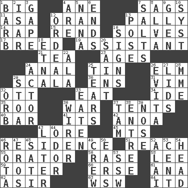 ACROSS 1. Of large size 4. One (Scot) 7. Settles 11. White ___ sheet 12. Northwest Algerian city 13. Chummy 14. Reproach for some lapse or misdeed 15. Tear apart 16. Finds the solution 17. A special lineage 19. Aide 21. Afternoon social gathering 23. Grows older 24. Of or related to the anus 25. Metal container 26. Shade tree 29. Any of the three canals of the cochlea 30. Followers of ems 31. Zeal 32. Baseball player Mel 33. Consume 34. Binary compound 35. Friend of Pooh 36. Armed conflict 37. Portable shelters 40. Tavern 41. It is 42. Small Philippine buffalo 43. Old wives' tales, e.g. 45. Mountains (abbr.) 46. Dwelling 51. Arrive at 55. Speaker 56. Raze (variant) 58. Area sheltered from the wind 59. Carrier 60. Celtic language 61. Santa ___, CA 62. SW Saudi Arabia district 63. Compass dir. 64. It would DOWN 1. Sharp remark 2. Austrian river, tributary to the Danube 3. Stare wonderingly 4. "We ___ not amused" (Victoria) 5. Nanny 6. Conclusions 7. Table seasonings 8. Inventor's middle name 9. Small, secluded valley 10. System (abbr.) 12. Severe or trying experience 13. Airs 16. Signals 18. Inactive volcano in Sicily 20. Inhabitant of Heaven 22. In the manner of 24. Thespian 25. Lacerates 26. Webber/Rice musical 27. Hats (slang) 28. Madame (abbr.) 29. Portico 32. Globe 33. Ingested 36. One who wires 37. Scottish cap 38. Main course 39. Characteristic smell of wine 43. 61 cubic inches 44. Scent 46. Round or rotation of duties 47. Greek god of love 48. Suttee (variant) 49. Group working together 50. Hearing organs 52. Jai ____ 53. Penny 54. Froth on beer 57. Compass dir.