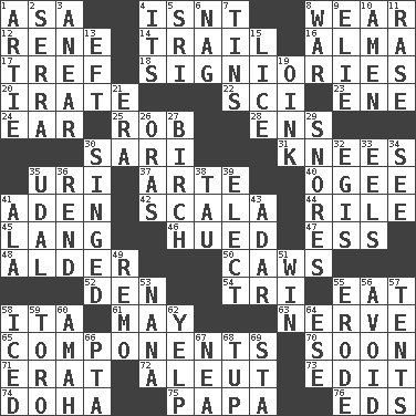 ACROSS 1. White ___ sheet 4. Is not 8. Put on (as clothing) 12. French philosopher Descartes 14. Go after with the intent to catch 16. _ mater 17. Unclean, religiously 18. Seigniories (variant) 20. Feeling or showing extreme anger 22. _-fi 23. Compass dir. 24. Hearing organ 25. Director Reiner 28. Followers of ems 30. Indian skirt 31. Leg joints 35. RI univ. 37. Johnson of "Laugh-In" 40. Double curve, resembling the letter S 41. An important port of Yemen 42. Any of the three canals of the cochlea 44. Cause heat under the collar 45. Austrian-born American filmmaker Fritz 46. Became colored 47. Curvy letter 48. Tree or shrub in the Birch family 50. Crow sounds 52. Lair 54. Three (prefix) 55. Consume 58. Call ___ day 61. Fifth month 63. Effrontery 65. Parts 70. Within a short period 71. Part of Q.E.F. 72. Native American of Southwest Alaska 73. Prepare for publication 74. Capital of the state of Qatar 75. Dad 76. Begley and Asner DOWN 1. Nick name for Arthur 2. Spanish missionary in California 3. Approach 4. It is 5. _ Lanka 6. Tired old horse 7. Canisters 8. Armed conflict 9. Writer Wiesel 10. So be it 11. Raze (variant) 13. Bank Draft (abbr.) 15. Louse (plural) 19. Pig sound 21. Period 26. Mouths or openings 27. A tree used for making furniture 29. Sounds asleep 30. Burned superficially 32. The front part of a cuirass 33. Snakelike fish 34. Perceive with the eye 35. Freehold land 36. Tear apart 38. The 19th letter of the Greek alphabet 39. Voters do this 41. Chicken ___ king 43. The sixth month of the Jewish calendar 49. San ____ (Riviera town) 51. Victory 53. Nanny 55. Wear away 56. Keep away from 57. Portable shelters 58. On the rocks 59. "Corrida" creature 60. Housemaid 62. Sharp bark 64. Compass dir. 66. Parent Teacher Association (abbr.) 67. Teachers' org. 68. Uncastrated adult male sheep 69. R.R. building
