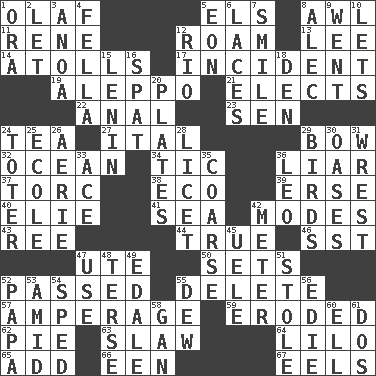 ACROSS 1. Norwegian king 5. Raised railways 8. Leather borer 11. French philosopher Descartes 12. Wander aimlessly 13. Area sheltered from the wind 14. Ringlike coral islands and reefs 17. Happening 19. City in Syria 21. Chooses 22. Of or related to the anus 23. Elected rep. 24. Beverage made from leaves 27. Slanted text style (abbr.) 29. Ribbon knot 32. Sea 34. Nervous spasm 36. One who doesn't tell the truth 37. Torque (variant) 38. Environmental prefix 39. Celtic language 40. Writer Wiesel 41. Ocean 42. Methods 43. To riddle 44. Loyal 46. Fast jet (abbr.) 47. Shoshoni 50. Arranges properly for use 52. Went by 55. Erase 57. Electrical Measurement 59. Worn away 62. Sliced dessert 63. Cole _ (cabbage dish) 64. _ and Stitch 65. Find the sum of 66. Car or cant ending 67. Snakelike fish DOWN 1. Mouth or opening 2. Allow 3. Small Philippine buffalo 4. Man or boy (slang) 5. Period of immesurable duration 6. Shoestrings 7. Grin 8. Actor Baldwin 9. Gone 10. Allows 12. River (Sp.) 15. Soviet premier 1918-24 16. Petty quarrel 18. Lair 20. Food holders 24. Carrier 25. Learning spot: Fr. 26. Nest on high 28. It is permitted: Lat. 29. Avian creatures 30. Fertile tracts in a desert 31. Obtain by seizing forcibly or violently 33. Adept person 35. Unrefined 36. Lion 42. Distance measurement 45. Ubangi River tributary 47. Purpose 48. Laconic 49. Peak District village in England 51. Took without asking 52. Dad 53. Among 54. Moved rapidly 55. Morning condensation 56. Singer Brickell 58. Separate the seeds from cotton 60. Pipe bend 61. Two (Sp.)
