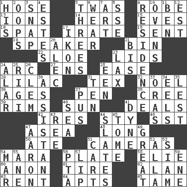 ACROSS 1. Stockings 5. It was, poetically 9. Loose flowing garment 13. Charged particles 14. Possessive pronoun 15. Nights before holidays 16. Petty quarrel 17. Feeling or showing extreme anger 18. Emitted 19. Orator 21. Storage container 22. A type of plum 23. Flaplike coverings 24. Curve 27. Followers of ems 28. Comfort 29. Pale purple color 31. John Ritter's dad 32. Christmas carol 36. Grows older 37. Writing instrument 38. Algonquian 39. Basketball hoops 40. Player for Phoenix 41. Allots cards 42. Angers 44. Filthy place 46. Fast jet (abbr.) 47. At sea 48. Yearn 50. Had dinner 51. Devices for capturing images 54. Hindu Mythology: god of death 56. Food holder 58. Writer Wiesel 60. Soon (poet.) 61. Hoop that covers a wheel 62. Actor Alda or Thicke 63. Monthly bill 64. Flats, for short 65. Not wild DOWN 1. Part of HMS, perhaps 2. I made a mistake 3. Fastener 4. _____ Park, CO 5. Threesomes 6. Put on (as clothing) 7. Tate display 8. Compass dir. 9. Home 10. Baking chambers 11. Benjamin's nick name 12. Eastern Standard Time (abbr.) 17. Image 20. Actor Baldwin 21. Again 23. Not strict 24. Having or resembling wings 25. Swiss mountan, "Queen of the Mountains" 26. Clement's nick name 28. Car or cant ending 30. Helper 31. "___ Little Indians" 33. Mouths or openings 34. Snakelike fish 35. For fear that 37. Ichor 40. Ocean 41. Unit of force 43. Portuguese money of account (variant) 44. Chalkboards 45. Heavy book 47. Composer Copland 49. Relatively large 51. Draw slowly or heavily 52. Silent film actress Nazimova 53. Thailand, formerly 54. Make imperfect 55. A saturated hydrocarbon 56. Parent Teacher Association (abbr.) 57. Mouth edge 59. Compass dir.