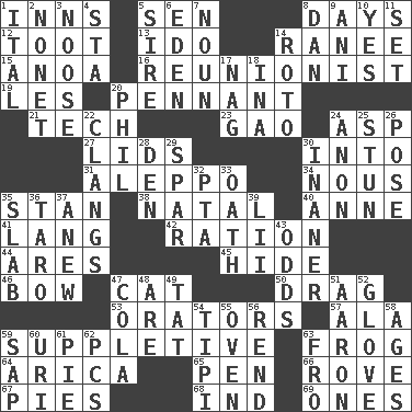 ACROSS 1. Restaurants 5. Elected rep. 8. 24-hour periods 12. A blast of a horn 13. Wedding promise 14. Indian princess (variant) 15. Small Philippine buffalo 16. One who advocates reunion 19. French article 20. Pre-World Series prize 21. Technical work 23. E Mali city 24. Viper 27. Flaplike coverings 30. To the inside or interior of 31. City in Syria 34. Horse sense 35. Comedian Laurel of Laurel & Hardy 38. Brizilian seaport 40. Queen of England 1702-14 41. Long (Scottish) 42. Food allowance for one day 44. Ancient Greek god of war 45. Flintstone garb 46. Arrow shooter 47. Feline 50. To be drawn or hauled along 53. Speakers 57. Wing 59. Supplementary 63. Tree-dwelling hopper 64. N. Chile seaport 65. Animal enclosure 66. Be footloose 67. Sliced desserts 68. Working for oneself (abbr.) 69. Washington bills DOWN 1. Slanted text style (abbr.) 2. Music written for nine 3. Trap for birds or small mammals 4. R.R. building 5. Male parent of an animal 6. Paradise 7. Part of speech 8. One of the 12 tribes of Israel 9. Cuckoo 10. Affirmative reply 11. Put into a specified state 14. Printing process, for short 17. Tired old horse 18. _ tizzy (2 wds.) 20. Silvers or Donahue 22. Rings like a ship's bell 24. At once, immediately (arch.) 25. Make senseless or dizzy 26. Introduce or present, as a question 28. Lair 29. Practice fight 30. More empty; more void 32. Parent Teacher Association (abbr.) 33. Pledge 35. Thick slice 36. Edible starchy tuberous root 37. Afresh 39. Cards in a Roman deck? 43. Probability 47. Root beer relative 48. "We ___ not amused" (Victoria) 49. Make lace 51. Composer Copland 52. Michael Jackson trademark 54. Native american tent (variation) 55. Baking chamber 56. Tear apart 58. Grows older 59. Plant excrement 60. RI univ. 61. Sliced dessert 62. Personal Computers (abbr.) 63. Away