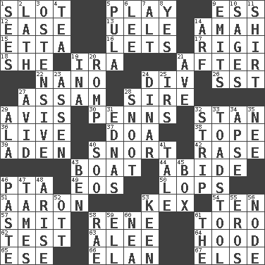ACROSS 1. Narrow opening 5. Frolic 9. Curvy letter 12. Comfort 13. Ubangi River tributary 14. Nanny 15. Singer James 16. Allows 17. Swiss mountan, "Queen of the Mountains" 18. A female animal or person 19. Retirement account (abbr.) 21. Following 22. Billionth: prefix 24. HTML Container Element 26. Fast jet (abbr.) 27. Indian state 28. Beget 29. Opinion 30. Actor Sean's family 32. Comedian Laurel of Laurel & Hardy 36. Moving, as bait 37. ___ good deed 38. Drink excessively 39. Arabian gulf 40. Derisive sound 42. To erase 43. Water vessel 44. Tolerate 46. Parent Teacher Assoc. 49. Greek goddess of the dawn 50. Chops off 51. Composer Copland 53. Dry husk or covering 54. Nine, plus one 57. Stricken, poetically 58. French philosopher Descartes 61. "Corrida" creature 62. Trial 63. Toward shelter 64. Parka part 65. Compass dir. 66. Style 67. Otherwise DOWN 1. Perceives with the eye 2. Thin strip of wood or metal 3. Clearly or manifestly demonstrative 4. Afternoon social gathering 5. Monetary unit of Botswana 6. Area sheltered from the wind 7. The first octave above the treble staff 8. Affirmative reply 9. Sends forth 10. Gurus 11. Chest covering 14. Sandy's bark 19. _ tizzy (2 wds.) 20. Frolic 21. "___ Maria" 23. NE Netherlands city 24. Middle Eastern gold or silver currency 25. Big collection agency 27. Enthusiastic 28. Snob 29. According to 31. Ferber et al. 32. Empty completely 33. Inedible or poisonous agaric 34. Domed church section 35. Born 40. "Barney Miller" actor Jack 41. Lie 43. Benjamin's nick name 45. Gift holder 46. Thick mixture 47. Makes less strong or intense 48. Originate 52. Baseball player Mel 53. Peachy ____! 55. Greek god of love 56. Connecting point 58. Actress Charlotte 59. Pipe bend 60. Teachers' org. 61. Definite Article