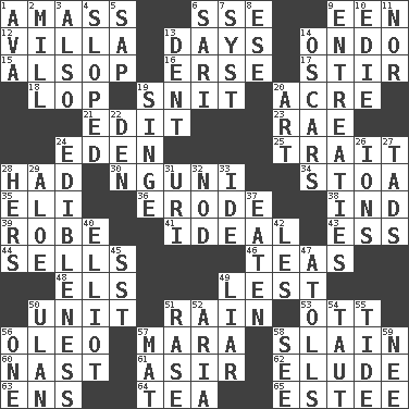 ACROSS 1. Collect or gather 6. Compass dir. 9. Car or cant ending 12. Country residence 13. 24-hour periods 14. Southwest Nigerian state 15. Columnist Joseph or Stewart 16. Celtic language 17. Move through with a circular motion 18. Chop off 19. In a ____ (agitated or irritated) 20. 43,560 square feet 21. Prepare for publication 23. Actress Charlotte 24. Genesis locale 25. Distinguishing feature 28. Possessed 30. Group of southern Bantu languages 34. Portico 35. Biblical high priest 36. Eat (away) 38. Working for oneself (abbr.) 39. Loose flowing garment 41. Standard of perfection 43. Curvy letter 44. Exchanges for money 46. Beverages made from leaves 48. Raised railways 49. For fear that 50. A single undivided whole 51. Precipitation 53. Baseball player Mel 56. Margarine 57. Hindu Mythology: god of death 58. Killed 60. Political cartoonist Thomas 61. SW Saudi Arabia district 62. Dodge 63. Followers of ems 64. Beverage made from leaves 65. First name in cosmetics DOWN 1. Actress Gardner 2. Place where flour is made 3. In addition 4. Inclined 5. Plant excrement 6. Indian skirt 7. System (abbr.) 8. Compass dir. 9. Pleas 10. Singer Brickell 11. Not either 13. Gouge 14. Motion picture awards 19. Scorch 20. Nonscientific branch of learning 22. Lair 24. The property of being fit to eat 26. Charged particles 27. Bits 28. Possessive pronoun 29. Medicinal plant 31. RI univ. 32. Allow head to fall sleepily 33. Binary compound 37. Eroded 40. American author Paul (1891-1958) 42. French article 45. Fast jet (abbr.) 47. Ringlike coral islands and reefs 49. One who doesn't tell the truth 50. ____ Bator 51. To erase 52. Operatic vocal solo 54. Strained 55. Periodic rise and fall of the sea level 56. Single 57. Floor covering 58. Observe 59. Born