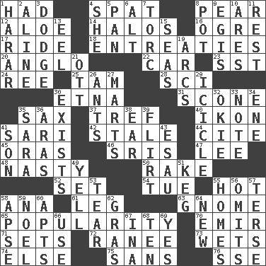 ACROSS 1. Possessed 4. Petty quarrel 8. Lightbulb-shaped fruit 12. _ vera 14. Auras 16. Legendary monster 17. Travel on or in a vehicle 18. Pleas 20. White American of non-Hispanic descent 22. Auto 23. Fast jet (abbr.) 24. To riddle 25. Scottish cap 28. _-fi 30. Inactive volcano in Sicily 31. Biscuitlike quick bread 35. Saxophone 37. Not kosher 40. Visual representation of an object 41. Indian skirt 42. Showing deterioration from age 44. Quote 45. Mouths or openings 46. Indian titles of respect 47. Area sheltered from the wind 48. Thoroughly unpleasant 50. Libertine 52. Put into a specified state 54. Third day of the wk. 55. Being at a high temperature 58. Santa ___, CA 61. Part of a journey 63. Dwarf 65. Teen's desire 70. Independent ruler or chieftain 71. Puts into a specified state 72. The wife of a rajah (variant) 73. Moistens 74. Otherwise 75. Without 76. Compass dir. DOWN 1. Ethiopian city, capital of Harari 2. Place in a line 3. Evade 4. A female animal or person 5. Baking dish 6. Keyboard modifier key 7. Torque (variant) 8. Plant holder 9. Armor plate that protects the chest 10. Ancient Greek god of war 11. Relief 13. Snakelike fish 15. Oceans 19. Curves 21. Baseball player Mel 26. Pismires 27. Shops 29. Hanging ice 30. Is extant 32. Migrant worker of the '30s 33. Observe 34. Compass dir. 35. "Two Mules for Sister ____" 36. Ancient river in northeast Turkey 38. Hearing organ 39. Seductive woman who exploits men 41. Boy, to dad 43. He sold his birthright 49. Shout 51. Barrel 53. Pull into pieces 55. Residences 56. Leaves out 57. Laconic 58. Domed church section 59. Christmas carol 60. Flats, for short 62. Pate de foie ____ 64. ___ Haven, CT 66. Purpose 67. _ tizzy (2 wds.) 68. Nine, plus one 69. Consenting reply