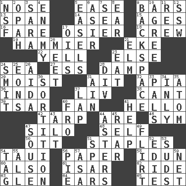 ACROSS 1. Characteristic smell of wine 5. Comfort 9. Oblong pieces of solid material 13. Connect, as a bridge 14. Toward the sea 15. Ripens 16. Conductor's collection 17. Flexible twig of a willow tree 18. Ship's personnel 19. More given to overacting 21. Supplement with great effort 22. Shout 23. Otherwise 24. Ocean 27. Curvy letter 28. Moist 29. Damp 31. Small island 32. Capital of Western Samoa 36. Southeast Asian peninsula 37. 54 in ancient Rome 38. Patter 39. Russian ruler of old 40. Air blower 41. Phone greeting 42. Canvas cover 44. "We ___ not amused" (Victoria) 46. Symbol (abbr.) 47. Grain storage tower 48. Automatically 50. Baseball player Mel 51. Paper fasteners 54. "Change" in Tahitian 56. Some stationery 58. Goddess of spring and wife of Bragi 60. In addition 61. Austrian river, tributary to the Danube 62. Travel on an animal 63. Small, secluded valley 64. Hearing organs 65. Trial DOWN 1. Science/research agcy. 2. Brightly colored fish 3. "Two Mules for Sister ____" 4. Foe 5. Artist's stands 6. SW Saudi Arabia district 7. Perceive with the eye 8. Hearing organ 9. Keyboard key 10. Match 11. To sift 12. Compass dir. 17. Lubricates 20. Rendezvous 21. Shade tree 23. Ingest 24. Stricken, poetically 25. Immeasurably long periods of time 26. Opera by Verdi 28. HTML Container Element 30. Making a chance decision by using lots 31. The 18th letter of the Arabic alphabet 33. Friends 34. Inwardly 35. Tiny particle 37. Pet locale 40. Away 41. Assist 43. Keyboard modifier key 44. Michaelmas daisies 45. Located in or toward the back 47. Lush 49. Talk or behave amorously 51. Practice fight 52. Singer Brickell 53. Beer foam 54. Label 55. Everything 56. Sliced dessert 57. White ___ sheet 59. Fish or hair follower