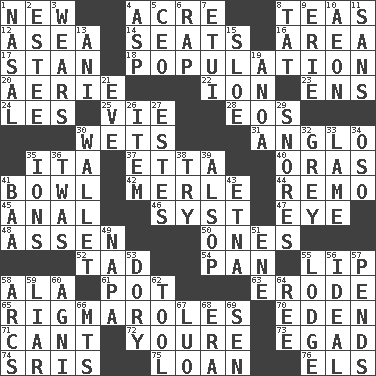ACROSS 1. ___ Haven, CT 4. Measure of real estate 8. Afternoon social gatherings 12. At sea 14. Theater features 16. Length times width 17. Comedian Laurel of Laurel & Hardy 18. Census information 20. Nest on high 22. Electrically charged atom 23. Followers of ems 24. French article 25. Compete 28. Greek goddess of the dawn 30. Moistens 31. White American of non-Hispanic descent 35. Call ___ day 37. Singer James 40. Mouths or openings 41. Soup holder 42. Haggard of country music 44. San ____ (Riviera town) 45. Of or related to the anus 46. System (abbr.) 47. Sight organ 48. NE Netherlands city 50. Singles 52. Small boy 54. Baking dish 55. Mouth edge 58. In the manner of 61. Cooking vessel 63. Eat (away) 65. Complicated, petty procedures 70. Locale of original sin 71. Patter 72. You are 73. Mild oath 74. Indian titles of respect 75. Grant temporary use of 76. Raised railways DOWN 1. Relating to the nose 2. First name in cosmetics 3. Puts on (as clothing) 4. Viper 5. Corporate head (abbr.) 6. Reproach for some lapse or misdeed 7. Needle case 8. Make lace 9. 4th largest of the Great Lakes 10. A really long time 11. Without 13. Cuckoo 15. A type of plum 19. Small Philippine buffalo 21. Night before a holiday 26. A whole individual unit 27. _____ Park, CO 29. Sounds asleep 30. Place for singles 32. Jennifer or Joel 33. Unable to walk 34. Bear (Spanish) 35. Charged particles 36. It was, poetically 38. Attempt 39. Columnist Joseph or Stewart 41. Sound made by sheep 43. Inactive volcano in Sicily 49. California wine valley 51. Compass dir. 53. Dinghy 55. Cabin 56. Standard of perfection 57. Depends 58. Arches 59. One who doesn't tell the truth 60. Hindu god of fire 62. Utensil 64. To riddle 66. Mountains (abbr.) 67. Nilotic language 68. Period 69. Elected rep.