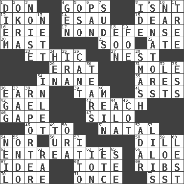 ACROSS 1. Spanish title 4. Republicans 8. Is not 12. Image 14. Son of Isaac 15. Letter starter 16. 4th largest of the Great Lakes 17. Unrelated to defense, as in spending 20. Vertical spar for supporting sails 21. "Barney Miller" actor Jack 22. Had dinner 23. Moral principle 27. A home for chicks 29. Part of Q.E.F. 31. Undercover agent 34. Lacking in sense or substance 35. Ancient Greek god of war 36. Merit 39. Scottish cap 41. Fast planes 42. Highlander 43. Arrive at 46. Open wide 47. Grain storage tower 48. "Beetle Bailey" pooch 51. Brizilian seaport 54. Or not 56. RI univ. 58. Deli pickle 61. Pleas 66. Medicinal plant 67. It may be bright or harebrained 68. Carry 69. Chest bones 70. Old wives' tales, e.g. 71. Single time 72. Fast jet (abbr.) DOWN 1. South Vietnam president (1954) 2. Gumbo ingredient 3. Annoying sound 4. Commissioned military rank (abbr.) 5. Bear (Spanish) 6. Baking dish 7. Soap bubbles 8. Binary compound 9. Elected representatives 10. Political cartoonist Thomas 11. Family _ (genealogy) 13. Remaining after all deductions 18. A really long time 19. Enemy 24. Layer 25. Retirement account (abbr.) 26. Patter 28. Box-office sellout 30. Rends 32. Allow 33. Curvy letter 34. An arm off of a larger body of water 36. Oval reproductive body of a fowl 37. American Automobile Association (abbr.) 38. News announcer 40. Count _ (2 wds.) 44. Insect wing 45. Small bed 49. Third day of the wk. 50. Mouth or opening 52. The sixth month of the Jewish calendar 53. Ms. Damita and namesakes 54. Famous astronaut Armstrong 55. Southwest Nigerian state 57. "Tell ____ the Marines!" 59. Tennis shots 60. For fear that 62. Actress Charlotte 63. Electrically charged atom 64. And so on (abbr.) 65. Observe