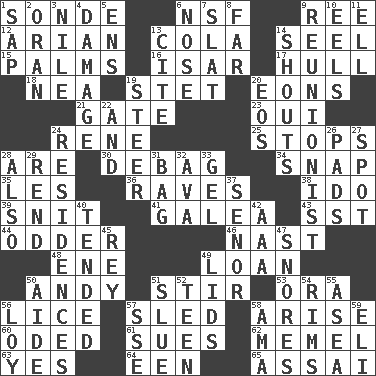 ACROSS 1. Something which is sent 6. Overdraft (abbr.) 9. To separate or throw off 12. Believer in; advocate of (suffix) 13. Root beer relative 14. Sew up the eyelids of hawks and falcons 15. Insides of hands 16. Austrian river, tributary to the Danube 17. Frame or body of a ship 18. Teachers' org. 19. Proofreading order 20. Immeasurably long periods of time 21. Yard entry 23. Fr. "Yes" 24. French philosopher Descartes 25. Closes up, plugs up 28. "We ___ not amused" (Victoria) 30. Debunk (Brit. slang) 34. Fastener 35. French article 36. All-night dance parties 38. Wedding promise 39. In a ____ (agitated or irritated) 41. An organ shaped like a helmet 43. Fast jet (abbr.) 44. More peculiar 46. Political cartoonist Thomas 48. Compass dir. 49. Grant temporary use of 50. Actor Griffith 51. Agitate 53. Mouth or opening 56. Louse (plural) 57. Downhill vehicle 58. Ascend 60. Wrote a lyric poem 61. Institutes legal proceedings 62. Klaipeda city 63. It is so 64. Car or cant ending 65. Slender Brazilian palm DOWN 1. Plant excrement 2. NW Algerian seaport 3. Mediterranean tributary 4. Break 5. Followers of ems 6. Olfactory organ 7. Narrow board 8. At a great distance 9. One who advocates reunion 10. Snakelike fish 11. Pipe bend 13. Quote 14. Yells 19. Guide 20. Greek goddess of the dawn 22. Also 24. Homes 26. Groovy apts. 27. Specific locale 28. In addition 29. Tear apart 31. Paper or plastic container 32. Actress Gardner 33. Set 37. Sir (Sp.) 40. Watched over 42. American Automobile Association (abbr.) 45. Marina Del _, California 47. Sounds asleep 49. Flaplike coverings 50. Assistant 51. Turn sharply 52. Adolescent 54. Basketball hoops 55. Toward the sea 56. Myrna of the movies 57. Compass dir. 58. Nanny (var.) 59. Connecticut Ivy Leaguer